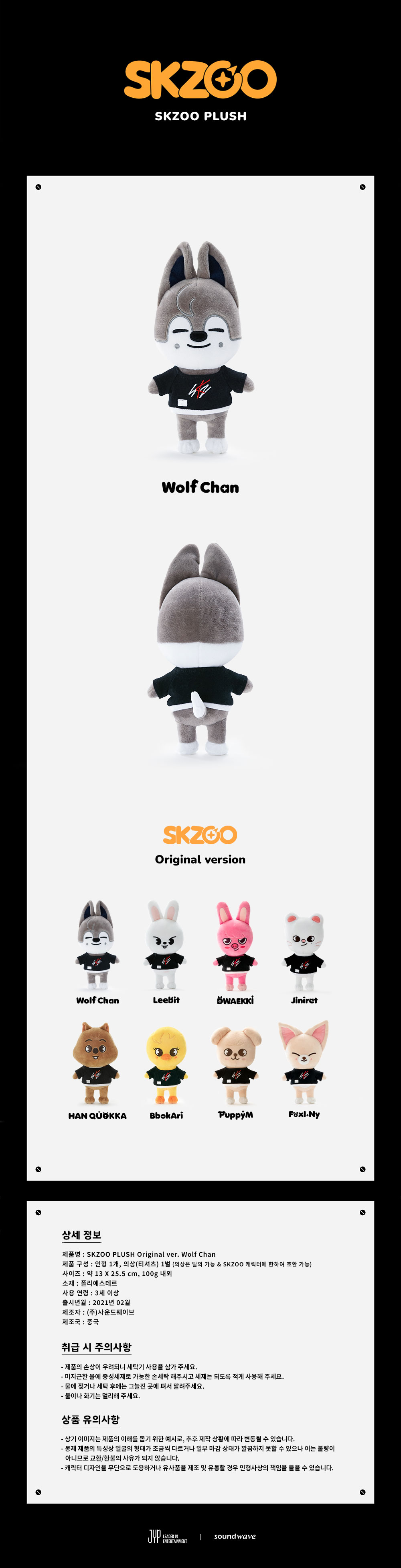 詳細情報運営方針レビューNOTICE* アウトケースは商品保護用制作されスクラッチ及び傷、変色などが包装/配送過程で生じる可能性がございます。これによる交換・返品はできかねます。[SKZOO PLUSH] Original Ver. (Wolf Chan) PART * The outer case is just for protecting goods. (scratches and discoloration on the case can not be the reason for exchanging or returning) INFORMATION 商品情報提供商品名 : [SKZOO PLUSH] Original Ver. (Wolf Chan)原産地 : Korea製造/輸入 : JYP Entertainment 사운드웨이브品質保証基準 : 関連法及び消費者紛争の解決規定に従うAS 責任者の連絡先 : Ktown4u, 02-552-0978