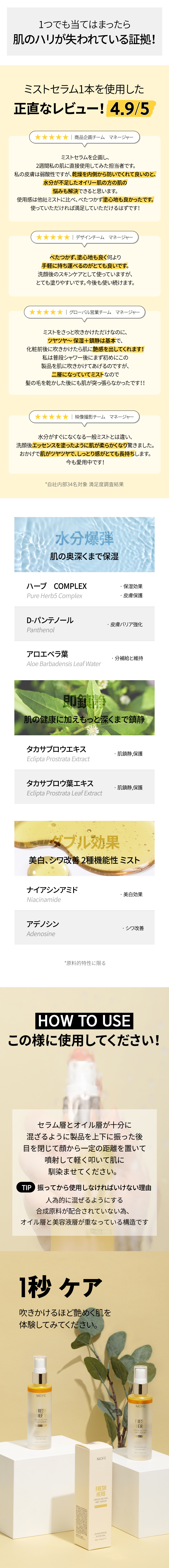 詳細情報運営方針レビューNOTICE* アウトケースは商品保護用制作されスクラッチ及び傷、変色などが包装/配送過程で生じる可能性がございます。これによる交換・返品はできかねます。NACIFIC Fresh Herb Origin Revival Mist Serum 100ml PART * The outer case is just for protecting goods. (scratches and discoloration on the case can not be the reason for exchanging or returning) INFORMATION 商品情報提供商品名 : Fresh Herb Origin Revival Mist Serum 100ml原産地 : Korea製造/輸入 : (주)에이빌코리아 (주)에이빌코리아品質保証基準 : 関連法及び消費者紛争の解決規定に従うAS 責任者の連絡先 : Ktown4u, 02-552-0978