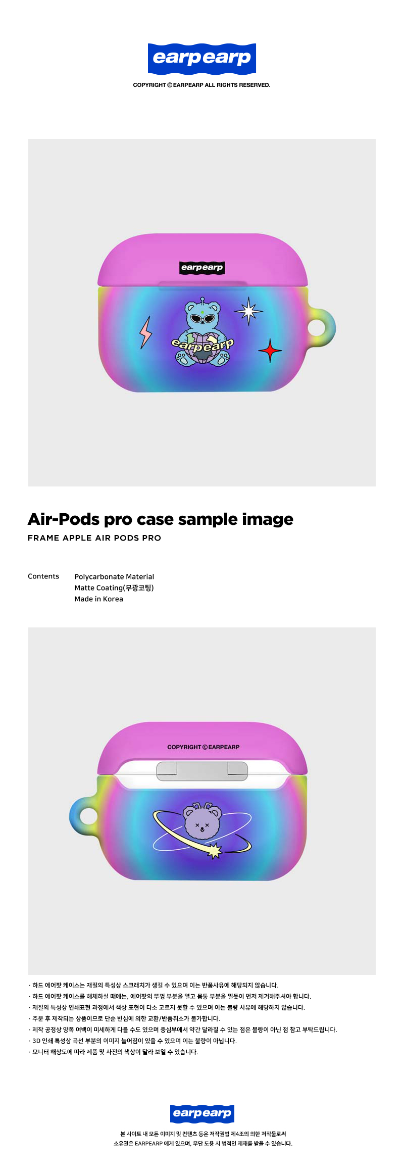 詳細情報運営方針レビューNOTICE* アウトケースは商品保護用制作されスクラッチ及び傷、変色などが包装/配送過程で生じる可能性がございます。これによる交換・返品はできかねます。[earpearp] Space night bear-rainbow (Hard air pods pro) 商品情報提供商品名 : [earpearp] Space night bear-rainbow (Hard air pods pro)原産地 : Korea製造/輸入 : earp earp earp earp品質保証基準 : 関連法及び消費者紛争の解決規定に従うAS 責任者の連絡先 : Ktown4u, 02-552-0978