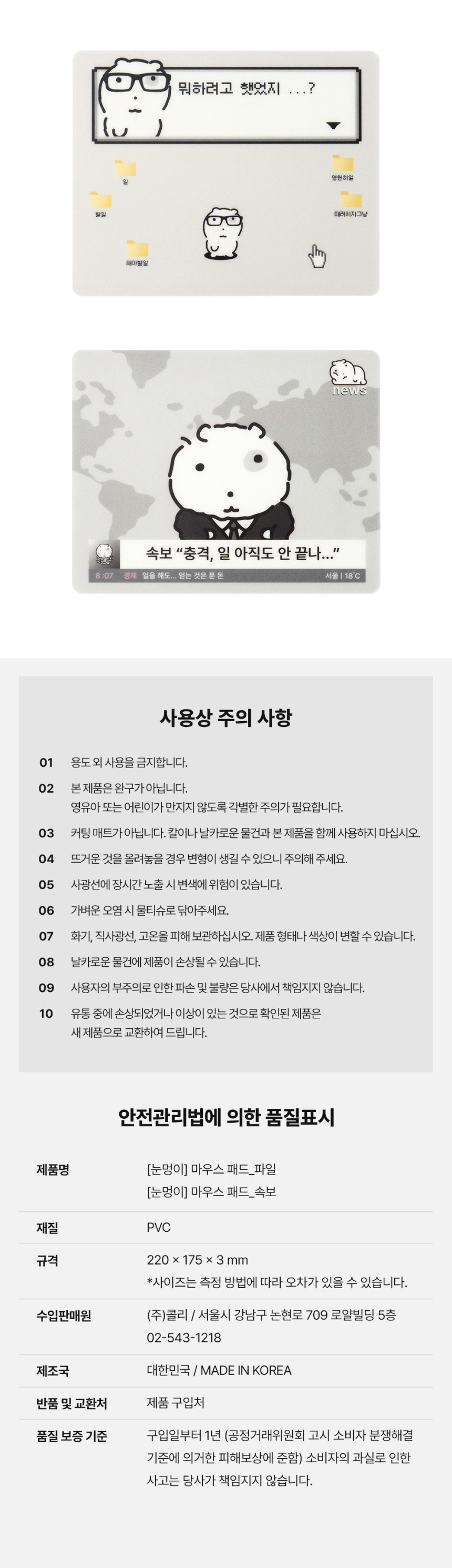 詳細情報運営方針レビューNOTICE* アウトケースは商品保護用制作されスクラッチ及び傷、変色などが包装/配送過程で生じる可能性がございます。これによる交換・返品はできかねます。[Nunmeong] Mouse Pad (2 types) PART INFORMATION 商品情報提供商品名 : [Nunmeong] マウスパッド (2種)原産地 : Korea製造/輸入 : 주식회사 콜리 品質保証基準 : 関連法及び消費者紛争の解決規定に従うAS 責任者の連絡先 : Ktown4u, 02-552-0978