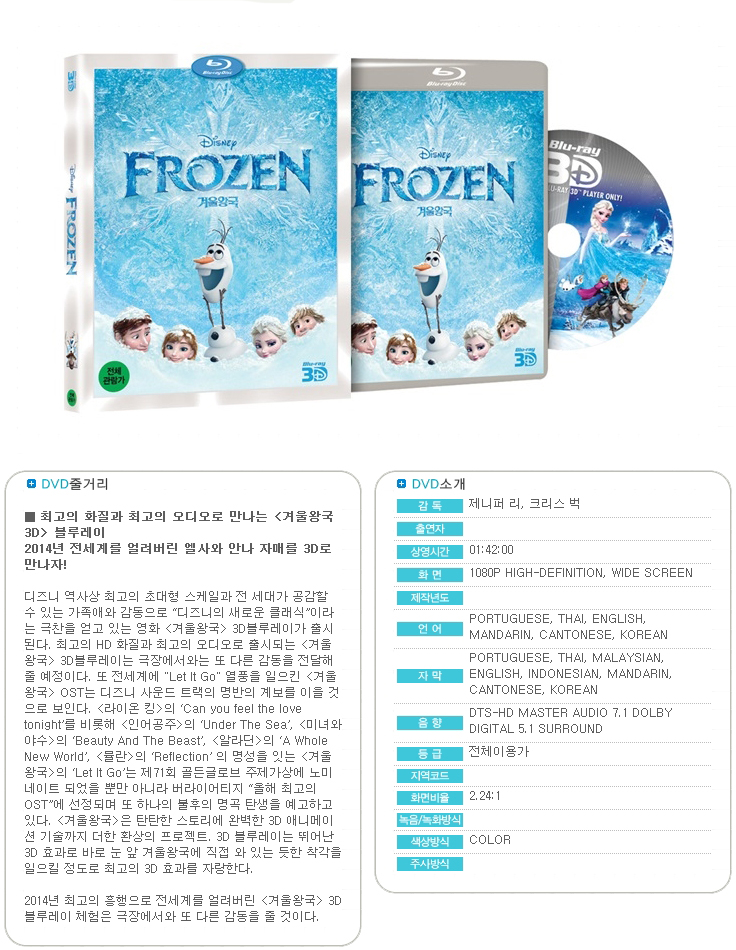 詳細情報運営方針レビューNOTICE* アウトケースは商品保護用制作されスクラッチ及び傷、変色などが包装/配送過程で生じる可能性がございます。これによる交換・返品はできかねます。- Language: Korean, English, Portuguese, Thai, Mandarin, Cantonese - Subtitle: Korean, English, Portuguese, Thai, Mandarin, Cantonese, Malaysian, Indonesian 商品情報提供商品名 : [Blu-Ray] Frozen (3D / 1DVD)原産地 : Korea製造/輸入 : 品質保証基準 : 関連法及び消費者紛争の解決規定に従うAS 責任者の連絡先 : Ktown4u, 02-552-0978
