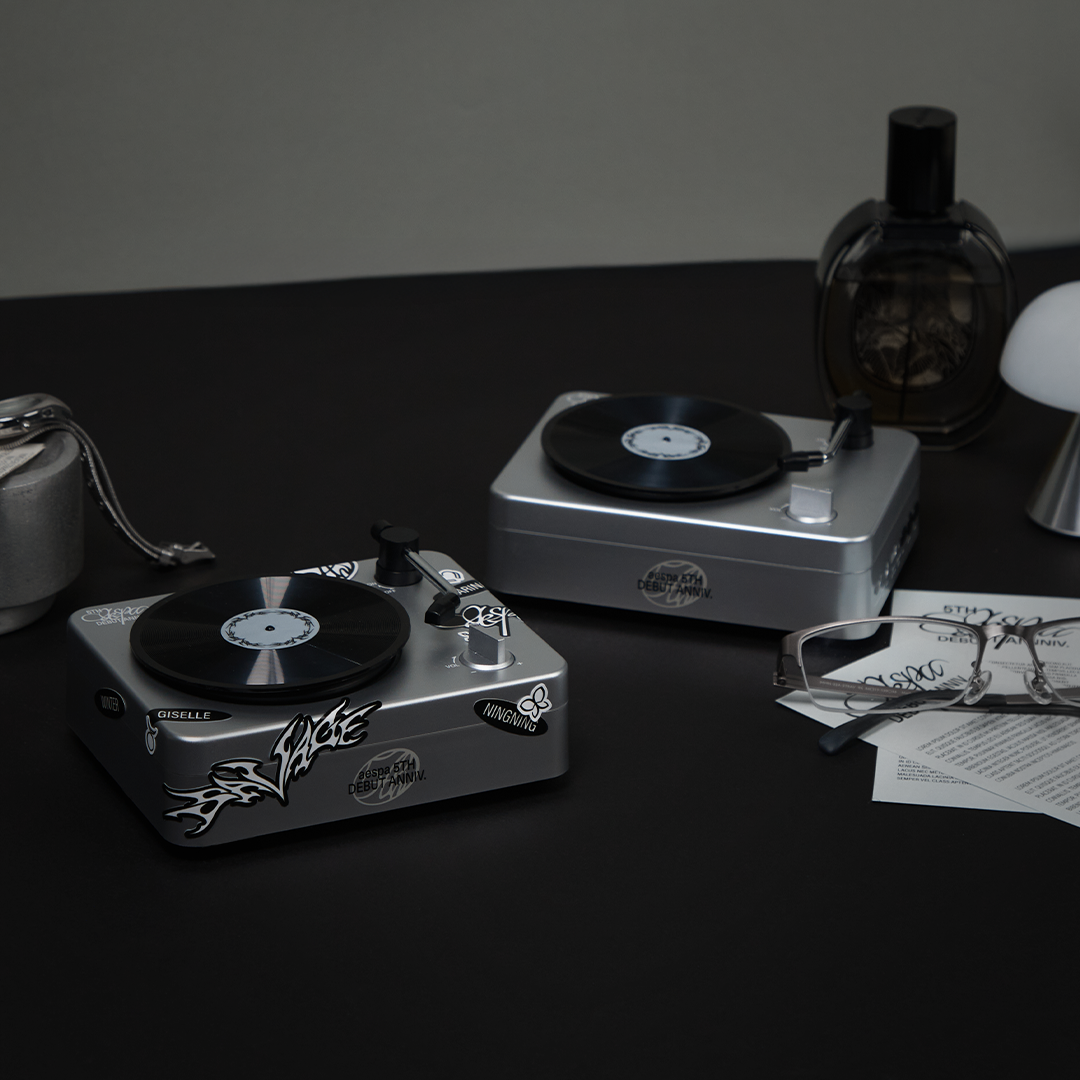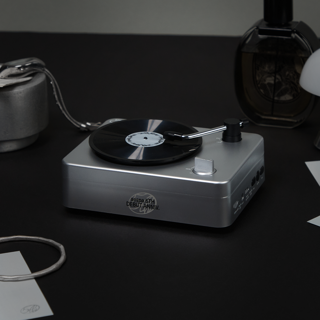 aespa [5TH ANNIVERSARY MD] TURNTABLE BLUETOOTH SPEAKER SET PART- 상품 : TURNTABLE BLUETOOTH SPEAKER SET - 구성 : 턴테이블 블루투스 스피커 1ea, LP판(모형) 1ea, 데코 스티커 1ea, 포토카드 1ea, 충전케이블 1ea, 3.5mm스테레오 케이블 1ea, 설명서 1ea - 소재 : ABS, PAPER - 사이즈(mm) : 턴테이블 스피커 130(W) X 100(D) X 50(H), 데코스티커 130 X 110, LP판(모형) 85 X 85, 포토카드 55 X 85 - 판매원 : SM BRAND MARKETING - 제조국 : CHINA - 제조년월 : 2026.01