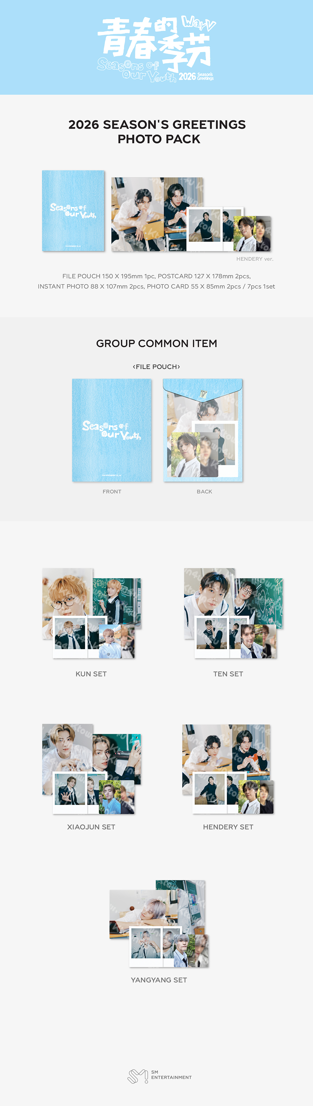 WayV [2026 SM ARTIST SEASON'S GREETINGS MD] PHOTO PACK PART상품 : 포토팩 (파일 파우치 1pc, 엽서 2pcs, 인스턴트 포토 2pcs, 포토카드 2pcs) 소재 : PAPER, PET 사이즈 : 파일 파우치 150 X 195, 엽서 127 X 178, 인스턴트 포토 88 X 107, 포토카드 55 X 85 (mm) 판매원 : SM ENTERTAINMENT 제조국 : 한국 제조 연월 : 2026.01
