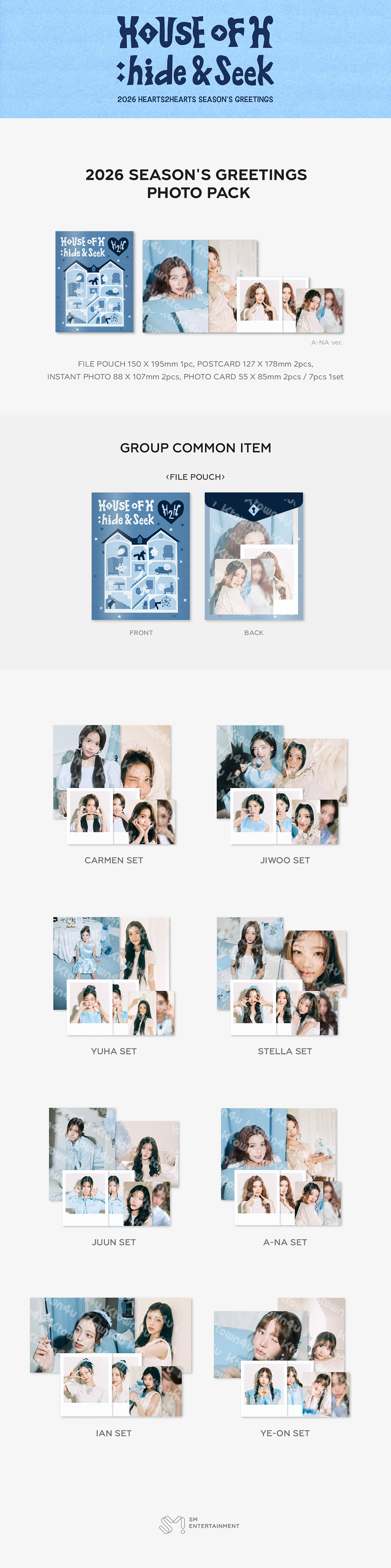 Hearts2Hearts [2026 SM ARTIST SEASON'S GREETINGS MD] PHOTO PACK PART상품 : 포토팩 (파일 파우치 1pc, 엽서 2pcs, 인스턴트 포토 2pcs, 포토카드 2pcs) 소재 : PAPER, PET 사이즈 : 파일 파우치 150 X 195, 엽서 127 X 178, 인스턴트 포토 88 X 107, 포토카드 55 X 85 (mm) 판매원 : SM ENTERTAINMENT 제조국 : 한국 제조 연월 : 2026.01
