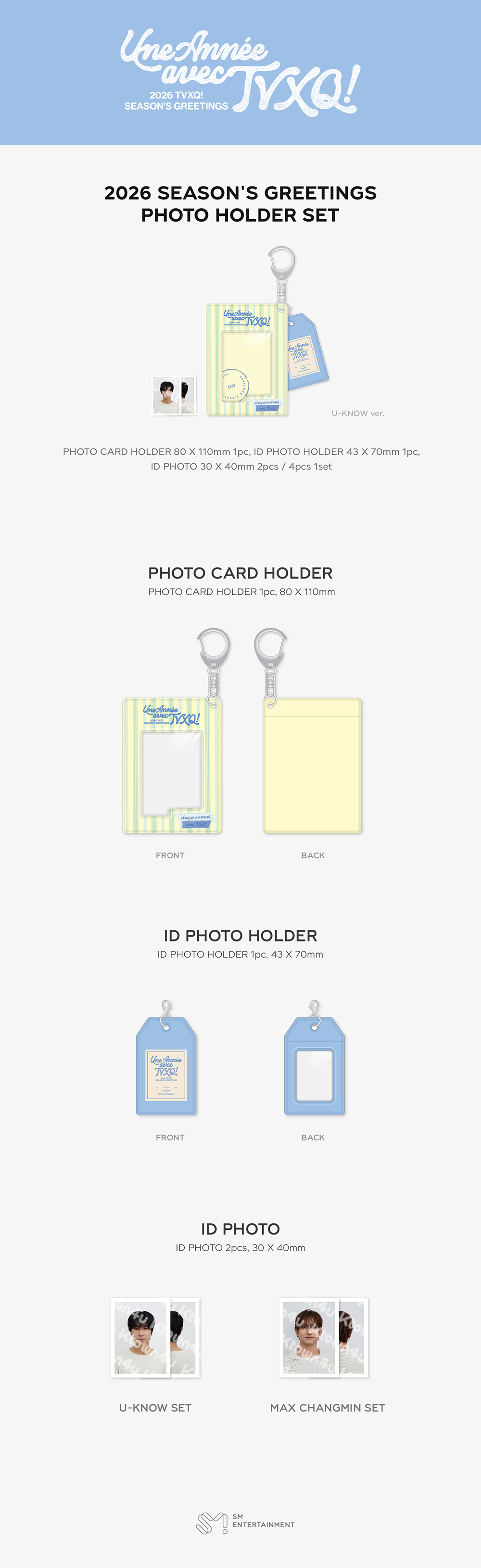 TVXQ! [2026 SM ARTIST SEASON'S GREETINGS MD] PHOTO HOLDER SET PART상품 : 포토홀더SET (포토카드 홀더 1pc, ID 포토홀더 1pc, ID 포토 2pcs) 소재 : PVC, METAL, PAPER 사이즈 : 포토카드 홀더, ID 포토 홀더 : 그룹별 상이, ID 포토 30 X 40 (mm) *TVXQ! - PHOTO CARD HOLDER 80 X 110mm / ID HOLDER 43 X 70mm *SUPER JUNIOR - PHOTO CARD HOLDER 80 X 110mm / ID HOLDER 63 X 70mm *GIRLS' GENERATION - PHOTO CARD HOLDER 88 X 119mm / ID HOLDER 55 X 75mm *Red Velvet - PHOTO CARD HOLDER 80 X 120mm / ID HOLDER 70 X 68mm *NCT 127 - PHOTO CARD HOLDER 80 X 110mm / ID HOLDER 48 X 62mm *NCT DREAM - PHOTO CARD HOLDER 102 X 110mm / ID HOLDER 55 X 75mm *WayV - PHOTO CARD HOLDER 94 X 122mm / ID HOLDER 75 X 72mm *aespa - PHOTO CARD HOLDER 91 X 123mm / ID HOLDER 50 X 70mm *RIIZE - PHOTO CARD HOLDER 80 X 110mm / ID HOLDER 55 X 63mm *NCT WISH - PHOTO CARD HOLDER 121 X 150mm / ID HOLDER 72 X 71mm *Hearts2Hearts - PHOTO CARD HOLDER 93 X 110mm / ID HOLDER 64 X 69mm 판매원 : SM ENTERTAINMENT 제조국 : 한국 제조 연월 : 2026.01