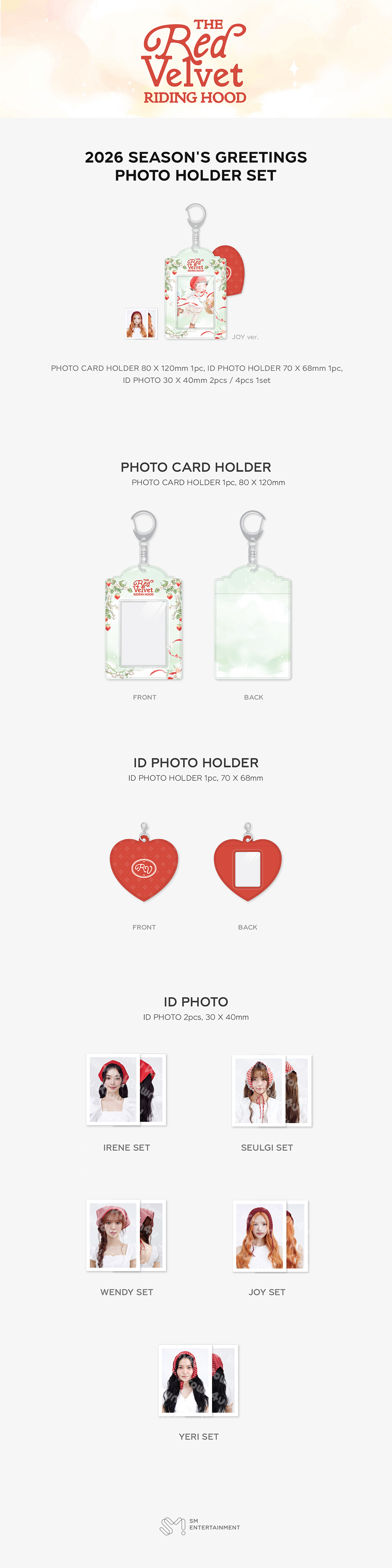 Red Velvet [2026 SM ARTIST SEASON'S GREETINGS MD] PHOTO HOLDER SET PART상품 : 포토홀더SET (포토카드 홀더 1pc, ID 포토홀더 1pc, ID 포토 2pcs) 소재 : PVC, METAL, PAPER 사이즈 : 포토카드 홀더, ID 포토 홀더 : 그룹별 상이, ID 포토 30 X 40 (mm) *TVXQ! - PHOTO CARD HOLDER 80 X 110mm / ID HOLDER 43 X 70mm *SUPER JUNIOR - PHOTO CARD HOLDER 80 X 110mm / ID HOLDER 63 X 70mm *GIRLS' GENERATION - PHOTO CARD HOLDER 88 X 119mm / ID HOLDER 55 X 75mm *Red Velvet - PHOTO CARD HOLDER 80 X 120mm / ID HOLDER 70 X 68mm *NCT 127 - PHOTO CARD HOLDER 80 X 110mm / ID HOLDER 48 X 62mm *NCT DREAM - PHOTO CARD HOLDER 102 X 110mm / ID HOLDER 55 X 75mm *WayV - PHOTO CARD HOLDER 94 X 122mm / ID HOLDER 75 X 72mm *aespa - PHOTO CARD HOLDER 91 X 123mm / ID HOLDER 50 X 70mm *RIIZE - PHOTO CARD HOLDER 80 X 110mm / ID HOLDER 55 X 63mm *NCT WISH - PHOTO CARD HOLDER 121 X 150mm / ID HOLDER 72 X 71mm *Hearts2Hearts - PHOTO CARD HOLDER 93 X 110mm / ID HOLDER 64 X 69mm 판매원 : SM ENTERTAINMENT 제조국 : 한국 제조 연월 : 2026.01