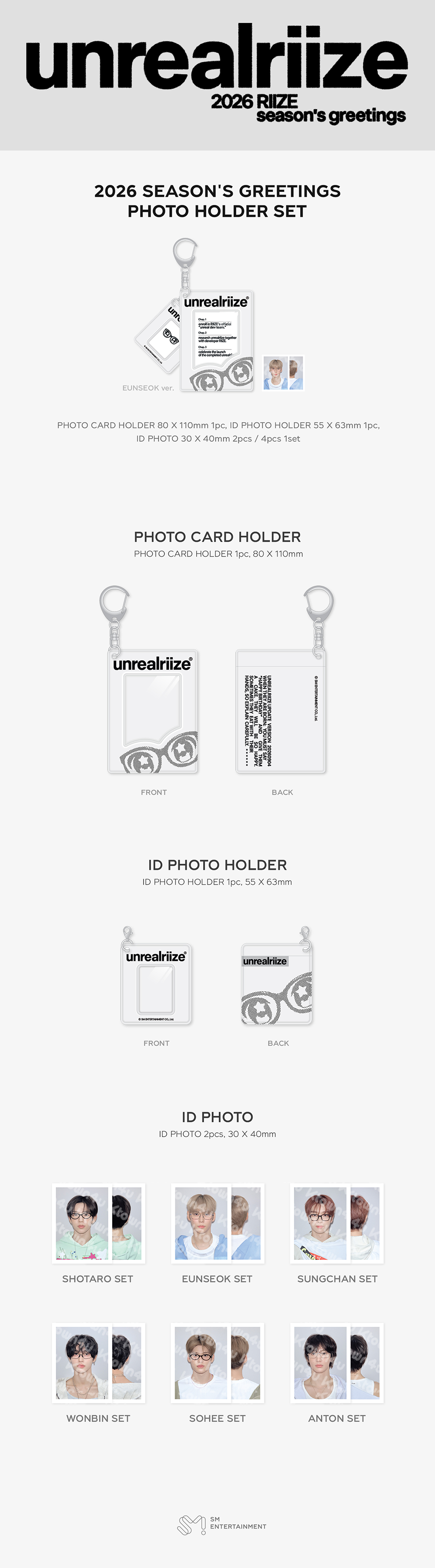 RIIZE [2026 SM ARTIST SEASON'S GREETINGS MD] PHOTO HOLDER SET PART상품 : 포토홀더SET (포토카드 홀더 1pc, ID 포토홀더 1pc, ID 포토 2pcs) 소재 : PVC, METAL, PAPER 사이즈 : 포토카드 홀더, ID 포토 홀더 : 그룹별 상이, ID 포토 30 X 40 (mm) *TVXQ! - PHOTO CARD HOLDER 80 X 110mm / ID HOLDER 43 X 70mm *SUPER JUNIOR - PHOTO CARD HOLDER 80 X 110mm / ID HOLDER 63 X 70mm *GIRLS' GENERATION - PHOTO CARD HOLDER 88 X 119mm / ID HOLDER 55 X 75mm *Red Velvet - PHOTO CARD HOLDER 80 X 120mm / ID HOLDER 70 X 68mm *NCT 127 - PHOTO CARD HOLDER 80 X 110mm / ID HOLDER 48 X 62mm *NCT DREAM - PHOTO CARD HOLDER 102 X 110mm / ID HOLDER 55 X 75mm *WayV - PHOTO CARD HOLDER 94 X 122mm / ID HOLDER 75 X 72mm *aespa - PHOTO CARD HOLDER 91 X 123mm / ID HOLDER 50 X 70mm *RIIZE - PHOTO CARD HOLDER 80 X 110mm / ID HOLDER 55 X 63mm *NCT WISH - PHOTO CARD HOLDER 121 X 150mm / ID HOLDER 72 X 71mm *Hearts2Hearts - PHOTO CARD HOLDER 93 X 110mm / ID HOLDER 64 X 69mm 판매원 : SM ENTERTAINMENT 제조국 : 한국 제조 연월 : 2026.01