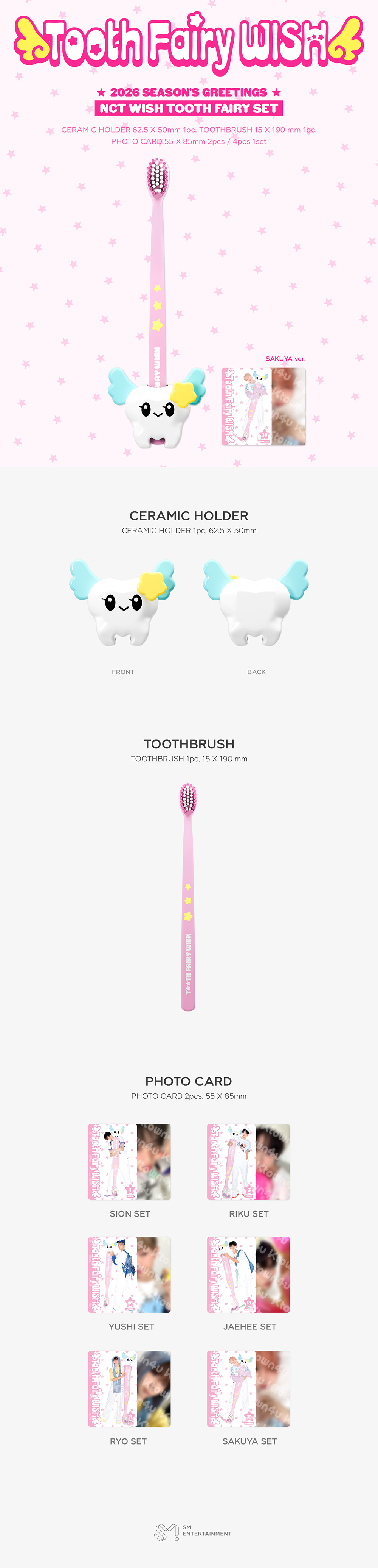 NCT WISH [2026 SM ARTIST SEASON'S GREETINGS MD] TOOTH FAIRY SET PART상품 : TOOTH FAIRY SET (세라믹 홀더 1pc, 칫솔 1pc, 포토카드 2pc) 소재 : CERAMIC, PP, PBT, PAPER 사이즈 : 세라믹 홀더 62.5 X 50, 칫솔 15 X 190 , 포토카드 55 X 85 (mm) 판매원 : SM ENTERTAINMENT 제조국 : 중국 제조 연월 : 2026.03