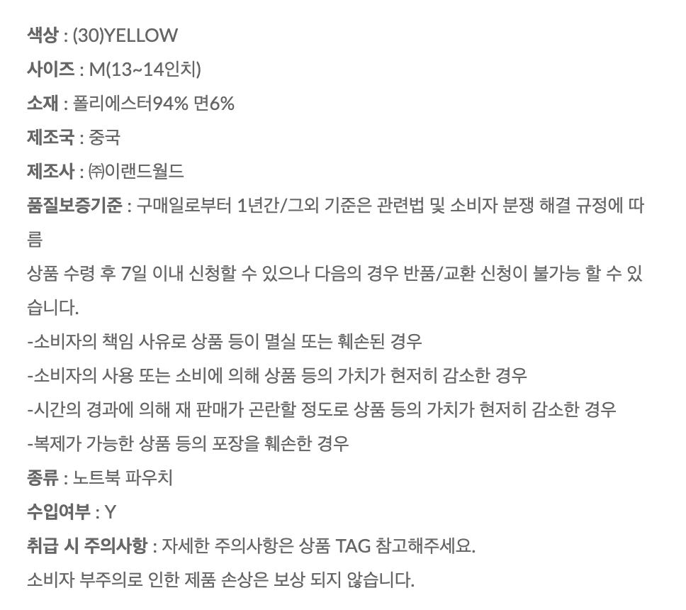 詳細情報運営方針レビューNOTICE* アウトケースは商品保護用制作されスクラッチ及び傷、変色などが包装/配送過程で生じる可能性がございます。これによる交換・返品はできかねます。[SPAO] [GANADI] Sweetness Max GANADI Laptop Pouch (YELLOW) PART INFORMATION 商品情報提供商品名 : [SPAO] [ガナディ] 甘さMAX ガナディ ノートパソコンポーチ(イエロー)原産地 : China製造/輸入 : (주)이랜드월드패션사업부 品質保証基準 : 関連法及び消費者紛争の解決規定に従うAS 責任者の連絡先 : Ktown4u, 02-552-0978