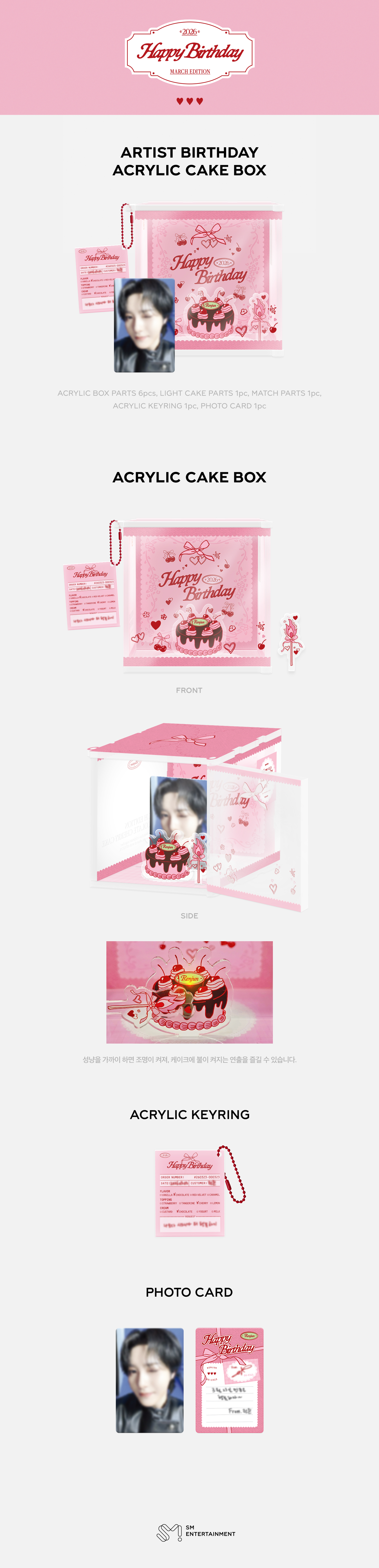 - 사이즈(mm) : 아크릴 박스 127 X 93 X 116, 케이크 조명 파츠 43 X 43 내외, 성냥 파츠 15 X 45 내외, 아크릴 키링 50 X 50 내외, 페트 45 X 60, 포토카드 55 X 85