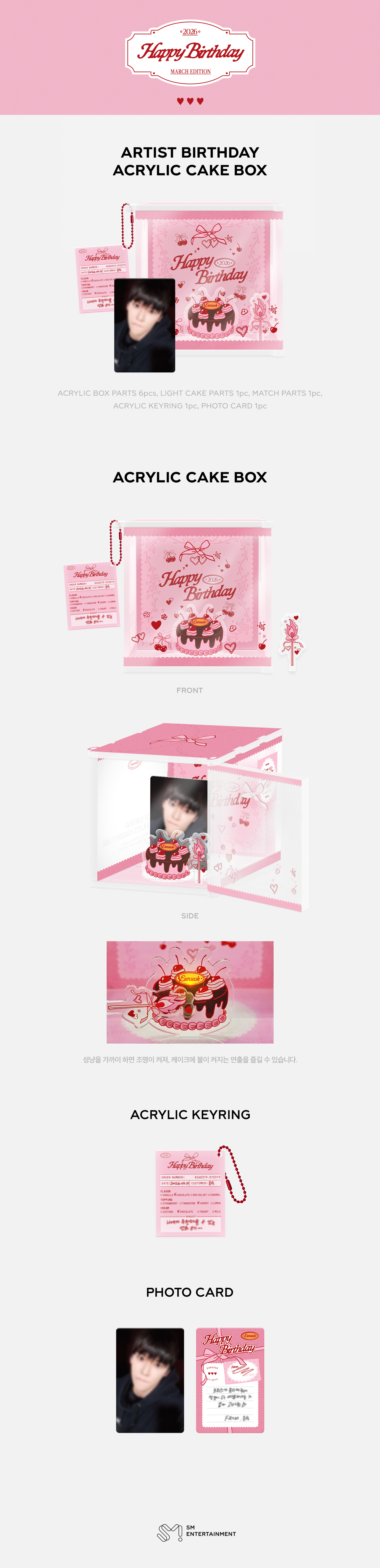 - 상품 : ACRYLIC CAKE BOX (아크릴 박스 6pcs, 케이크 조명 파츠 1pc, 성냥 파츠 1pc, 아크릴 키링 1pc, 포토카드 1pc)