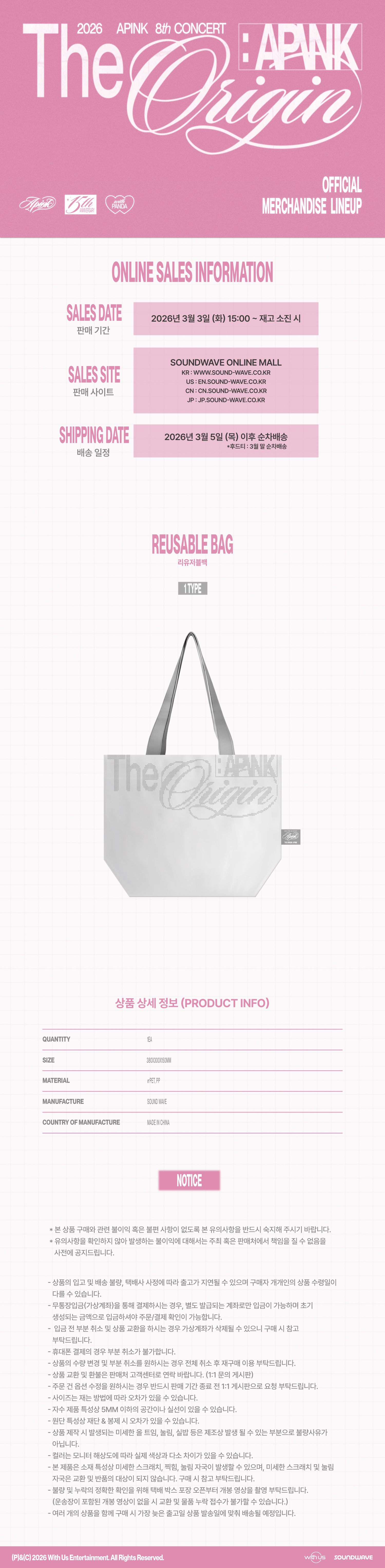 ApinkAPINK - [8TH CONCERT [The Origin APINK] MD] REUSABLE BAG¥1,466発売日2026-03-13入荷予定日2026-03-13マイレージ12Goods codeGD00158536