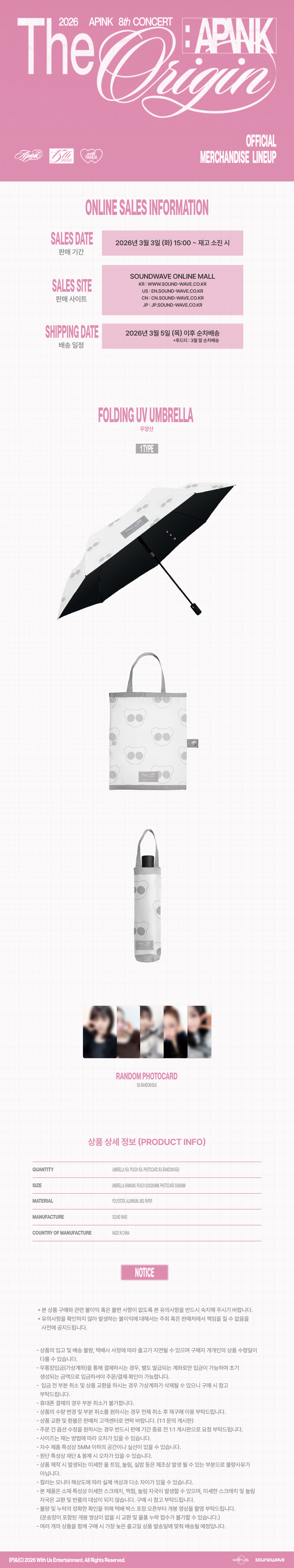 ApinkAPINK - [8TH CONCERT [The Origin APINK] MD] FOLDING UV UMBRELLA¥4,275発売日2026-03-13入荷予定日2026-03-13マイレージ35Goods codeGD00158537