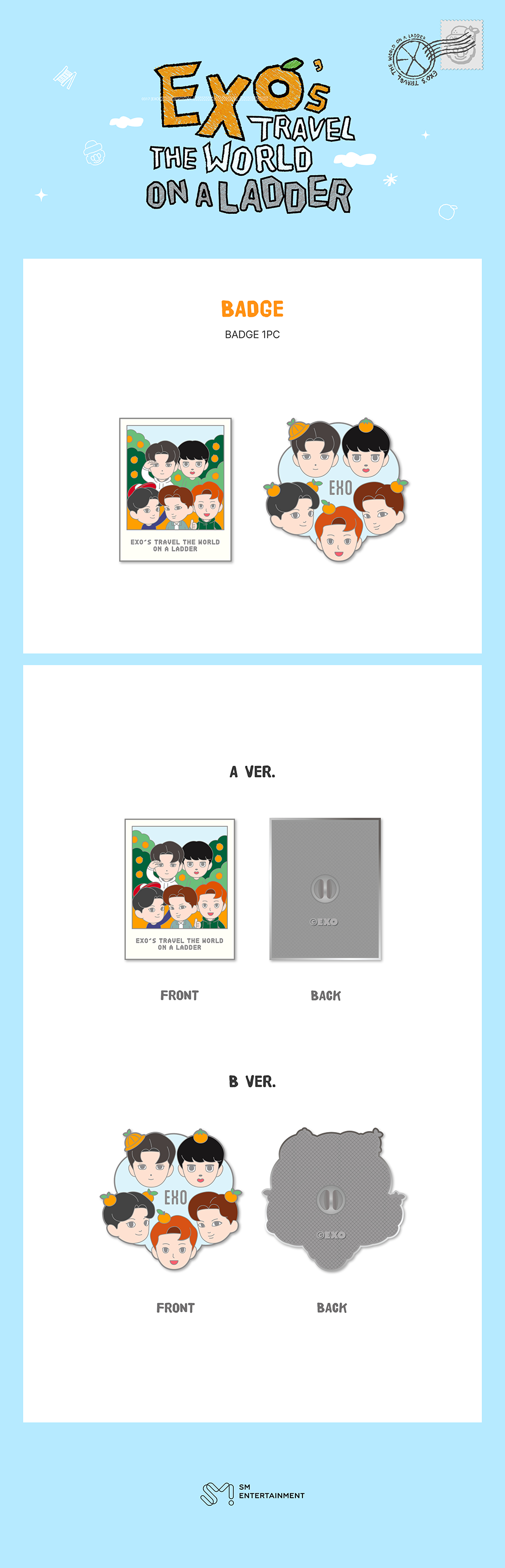EXO [2026 [EXO의 사다리타고 세계여행5] MD] BADGE PART상품 : 뱃지 (1pc) 소재 : METAL, EPOXY 사이즈 : A ver. 40 X 50 / B ver. 45 X 45 (MM) 판매원 : SM ENTERTAINMENT 제조국 : 중국 제조 연월 : 2026.03