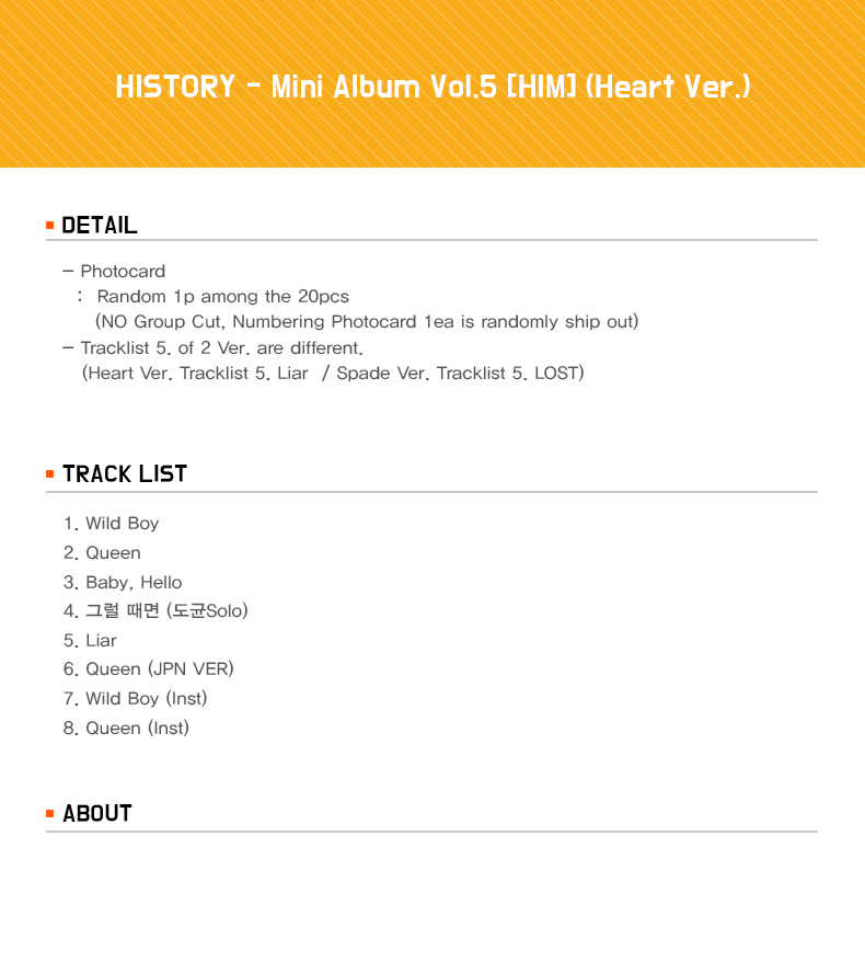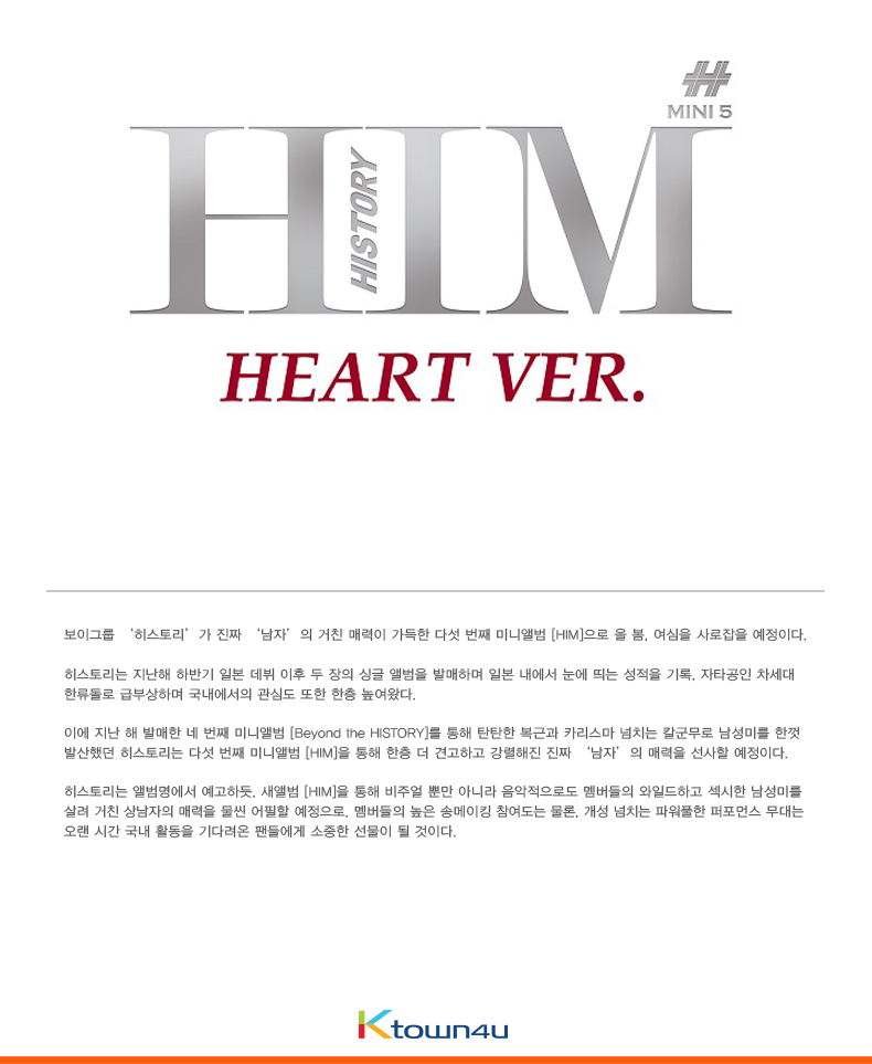 詳細情報運営方針レビューNOTICE* アウトケースは商品保護用制作されスクラッチ及び傷、変色などが包装/配送過程で生じる可能性がございます。これによる交換・返品はできかねます。 商品情報提供商品名 : HISTORY - Mini Album Vol.5 [HIM] (Heart Ver.)原産地 : Korea製造/輸入 : 品質保証基準 : 関連法及び消費者紛争の解決規定に従うAS 責任者の連絡先 : Ktown4u, 02-552-0978