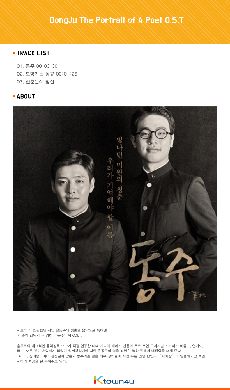 詳細情報運営方針レビューNOTICE* アウトケースは商品保護用制作されスクラッチ及び傷、変色などが包装/配送過程で生じる可能性がございます。これによる交換・返品はできかねます。商品情報提供商品名 : DongJu The Portrait of A Poet O.S.T原産地 : Korea製造/輸入 : (주)윈드밀이엔티 品質保証基準 : 関連法及び消費者紛争の解決規定に従うAS 責任者の連絡先 : Ktown4u, 02-552-0978