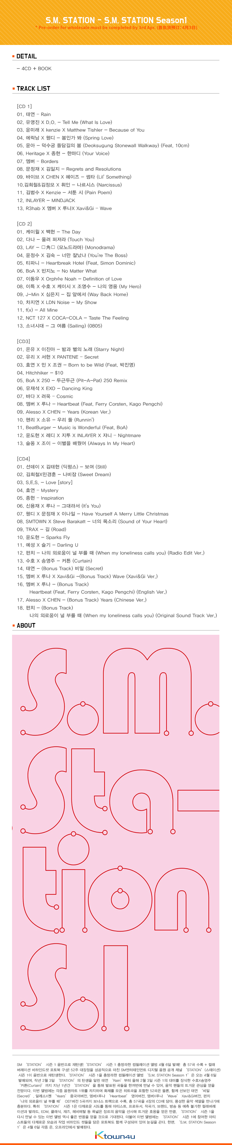 詳細情報運営方針レビューNOTICE* アウトケースは商品保護用制作されスクラッチ及び傷、変色などが包装/配送過程で生じる可能性がございます。これによる交換・返品はできかねます。商品情報提供商品名 : S.M. STATION - S.M. STATION Season1原産地 : Korea製造/輸入 : 品質保証基準 : 関連法及び消費者紛争の解決規定に従うAS 責任者の連絡先 : Ktown4u, 02-552-0978