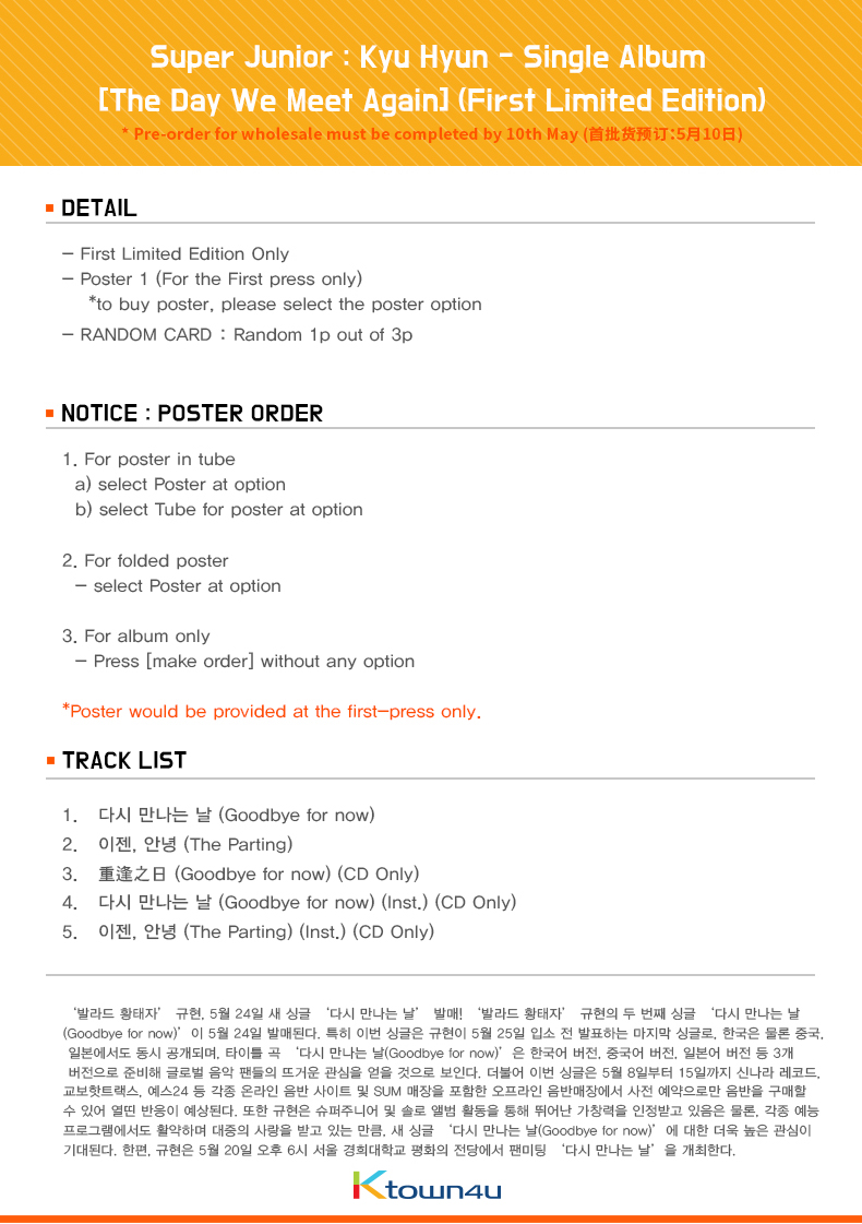 詳細情報運営方針レビューNOTICE* アウトケースは商品保護用制作されスクラッチ及び傷、変色などが包装/配送過程で生じる可能性がございます。これによる交換・返品はできかねます。商品情報提供商品名 : ギュヒョン (Kyu Hyun : Super Junior)- Single Album [The Day We Meet Again(また会う日)]原産地 : Korea製造/輸入 : 品質保証基準 : 関連法及び消費者紛争の解決規定に従うAS 責任者の連絡先 : Ktown4u, 02-552-0978