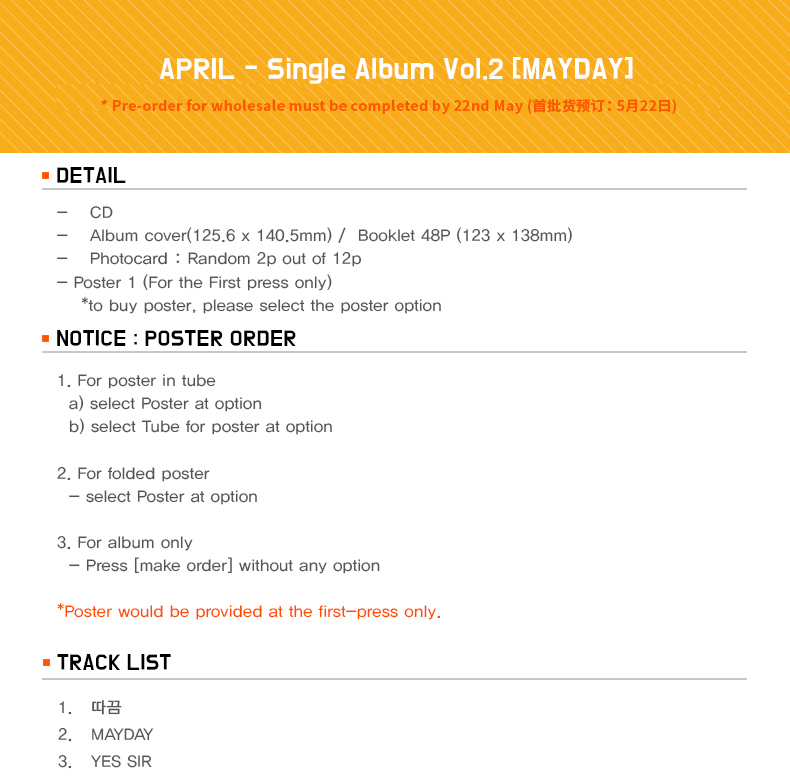 詳細情報運営方針レビューNOTICE* アウトケースは商品保護用制作されスクラッチ及び傷、変色などが包装/配送過程で生じる可能性がございます。これによる交換・返品はできかねます。商品情報提供商品名 : APRIL - Single Album Vol.2 [MAYDAY]原産地 : Korea製造/輸入 : 品質保証基準 : 関連法及び消費者紛争の解決規定に従うAS 責任者の連絡先 : Ktown4u, 02-552-0978