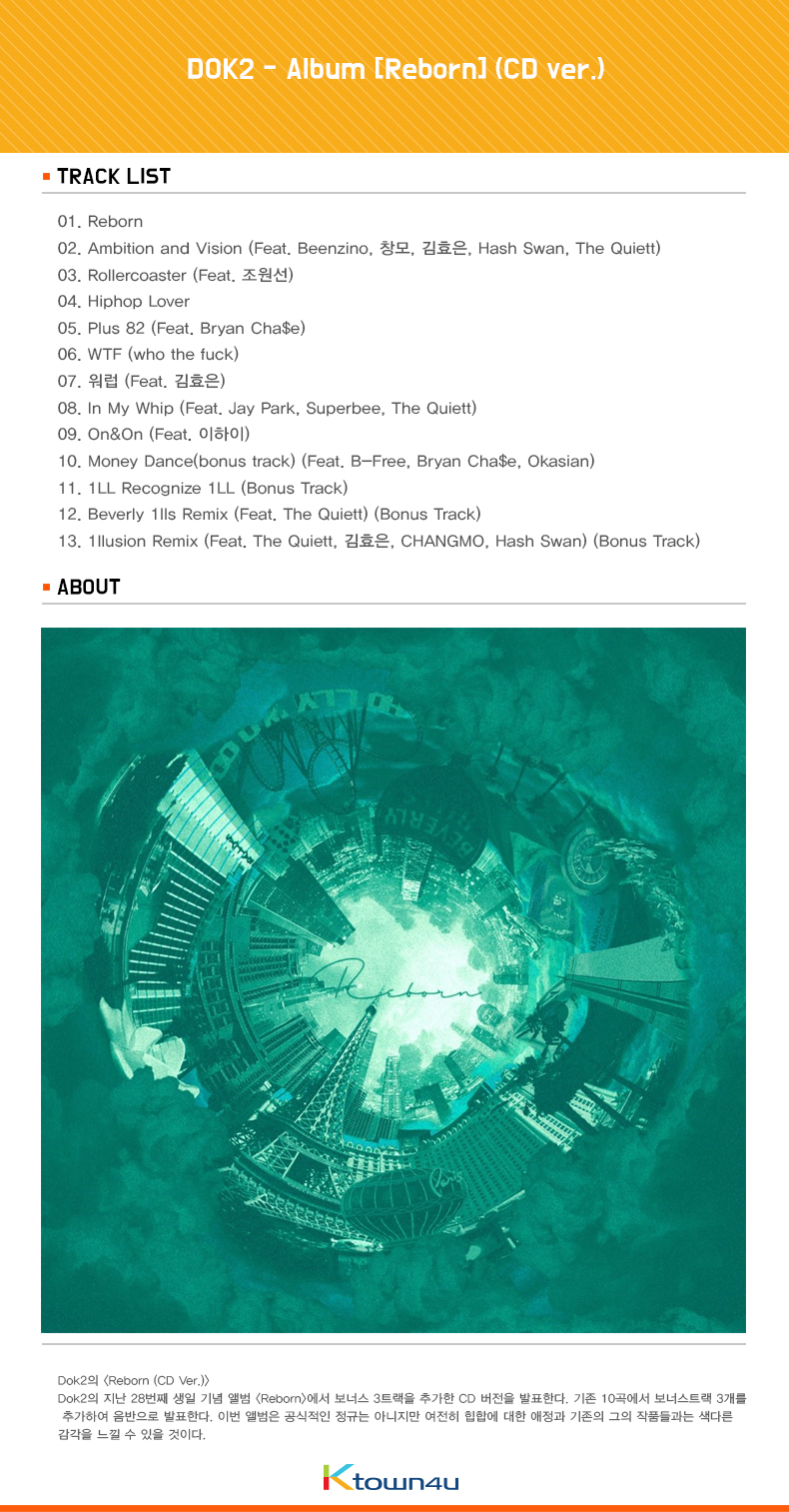 詳細情報運営方針レビューNOTICE* アウトケースは商品保護用制作されスクラッチ及び傷、変色などが包装/配送過程で生じる可能性がございます。これによる交換・返品はできかねます。商品情報提供商品名 : DOK2 - Album [Reborn] (CD ver.)原産地 : Korea製造/輸入 : 品質保証基準 : 関連法及び消費者紛争の解決規定に従うAS 責任者の連絡先 : Ktown4u, 02-552-0978