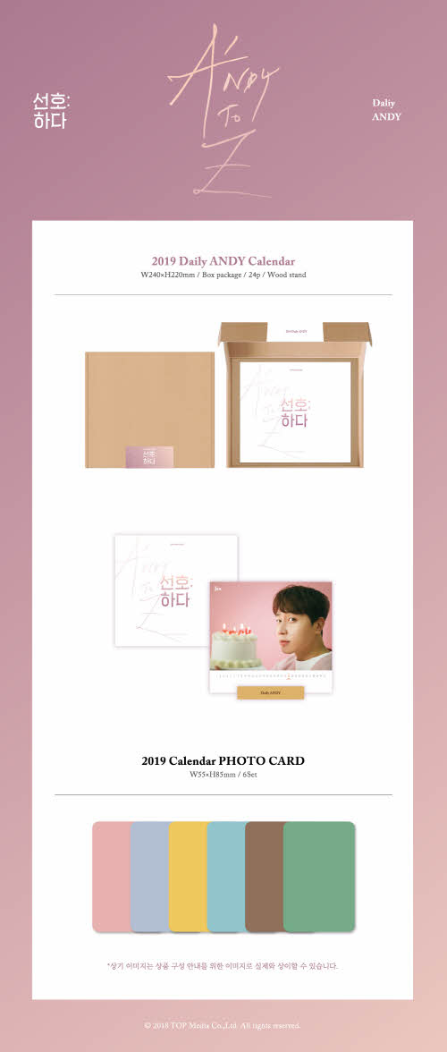 앤디 (ANDY)’, 팬들 위한 특별한 선물!‘Daily ANDY’ 선보인다2019년의 모든 날들을 앤디와 함께 가수 앤디가 올 겨울 팬들을 위해 를 선보인다.  앤디의 모든 것을 담아냈다는 의미를 내포하고 있는 는 팬들을 위해 준비한 특별한 시리즈로 ‘ANDY’의 이니셜을 딴 총 4가지 버전의 시리즈가 준비되어 있다.  그 중에서도 ‘D’ 버전은 ‘Daily ANDY’를 의미하는 2019년 캘린더로, 팬들이 2019년의 모든 날을 앤디와 함께할 수 있도록 준비한 특별한 선물이다. 이번 캘린더에서는 컬러풀하고 캐주얼한 앤디의 모습들을 확인할 수 있다.   의 ‘Daily ANDY’는 오는 31일 발매된다.