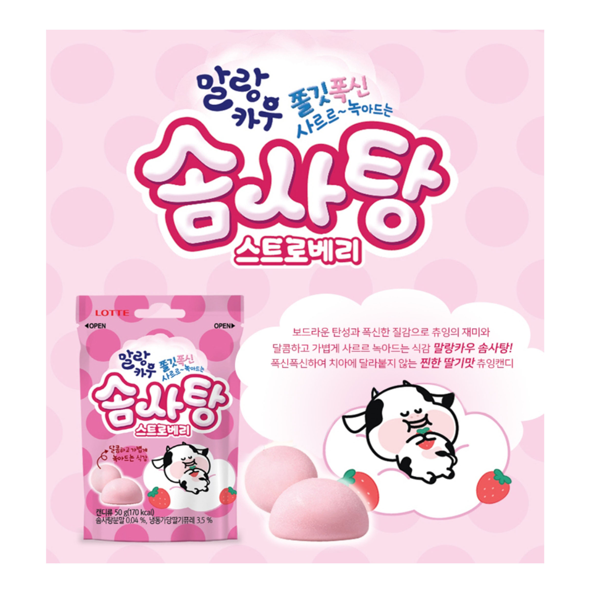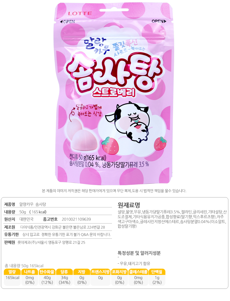 詳細情報運営方針レビューNOTICE* アウトケースは商品保護用制作されスクラッチ及び傷、変色などが包装/配送過程で生じる可能性がございます。これによる交換・返品はできかねます。[LOTTE] Malang Cow Cotton Candy Strawberry 50g 商品情報提供商品名 : [LOTTE] マランカウ わたあめイチゴ味 50g原産地 : Korea製造/輸入 : 品質保証基準 : 関連法及び消費者紛争の解決規定に従うAS 責任者の連絡先 : Ktown4u, 02-552-0978