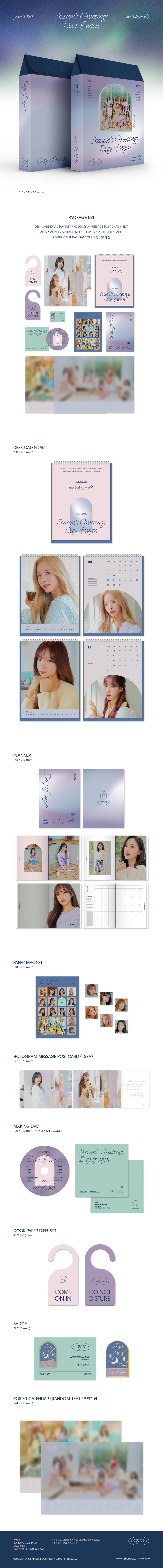 2020 우주소녀 시즌 그리팅은 촬영 비하인드 영상이 담긴 DVD를 비롯해 캘린더, 플래너, 홀로그램 메시지 카드, 페이퍼 마그넷, 종이 디퓨저, 포스터 캘린더, 뱃지 등으로 다양하게 구성된 우주소녀의 2020 시즌 그리팅은 언제나 응원해주는 팬 '우정'과 함께 2020년 매 순간마다 함께하고 싶은 우주소녀의 마음을 담아 구성하였다.