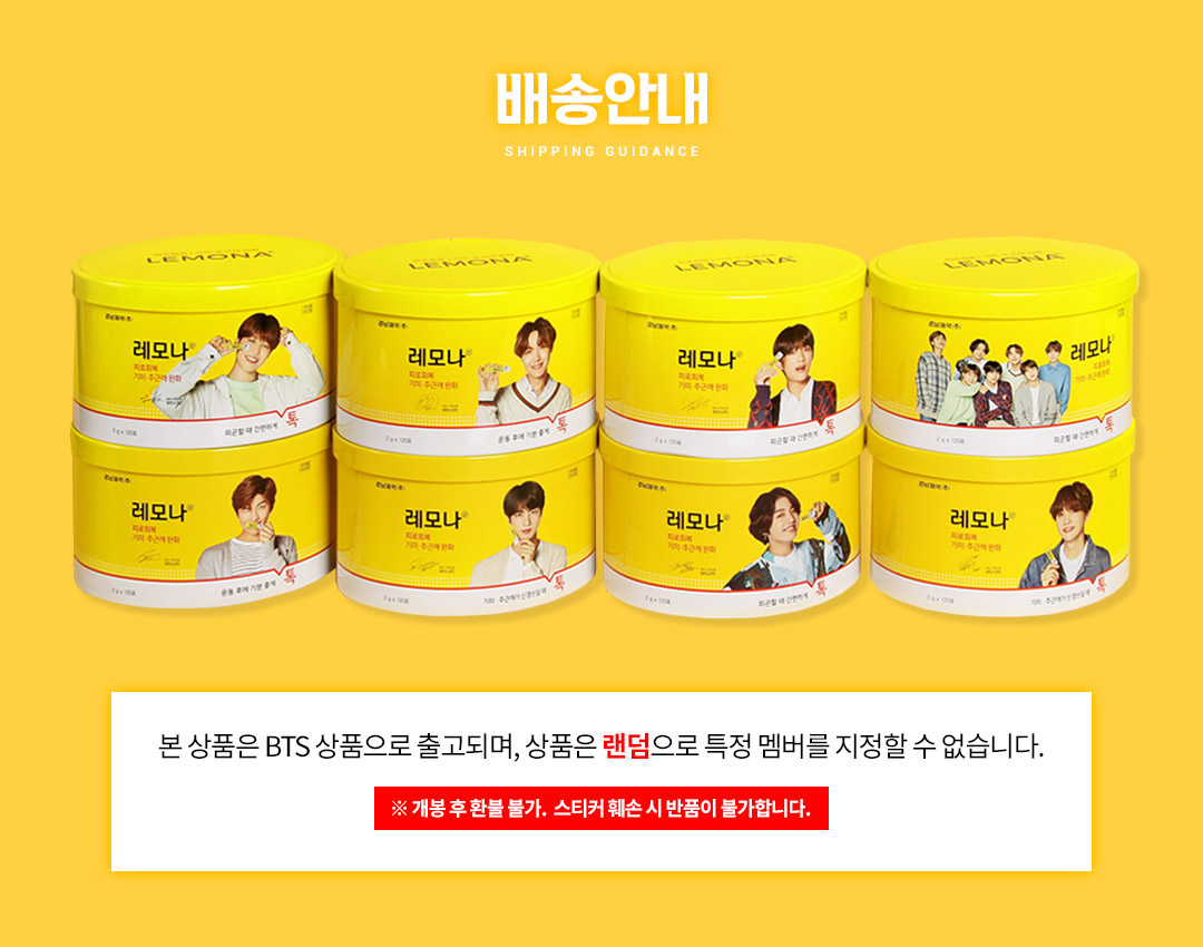 詳細情報運営方針レビューNOTICE* アウトケースは商品保護用制作されスクラッチ及び傷、変色などが包装/配送過程で生じる可能性がございます。これによる交換・返品はできかねます。[kyungnampharm] BTS : Lemona 2g*120ea - Out case : Random 1p out of 8p - Lemona portable case : 1p (randomly included only in some quantities of product / not included in all product) 商品情報提供商品名 : [kyungnampharm] BTS : Lemona 2g*120ea (*Order can be canceled cause of early out of stock)原産地 : Korea製造/輸入 : 品質保証基準 : 関連法及び消費者紛争の解決規定に従うAS 責任者の連絡先 : Ktown4u, 02-552-0978