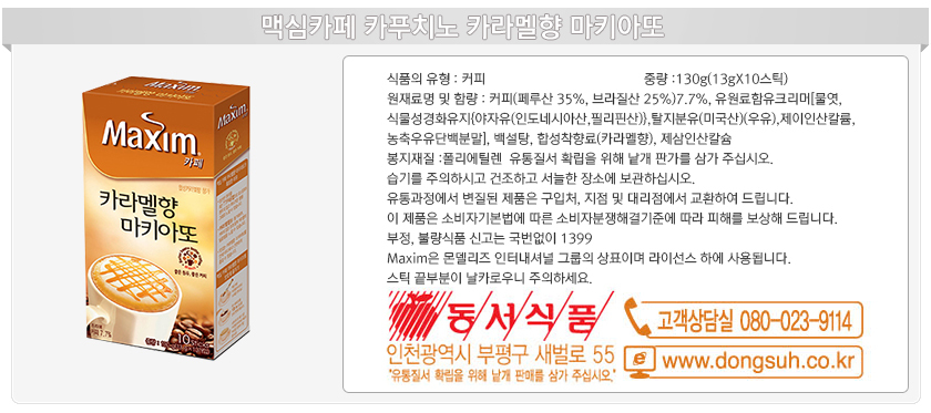 詳細情報運営方針レビューNOTICE* アウトケースは商品保護用制作されスクラッチ及び傷、変色などが包装/配送過程で生じる可能性がございます。これによる交換・返品はできかねます。[東西食品] マクシムカフェキャラメルマキアート13g 商品情報提供商品名 : [マクシム] カフェキャラメルマキアートコーヒー13g*10EA原産地 : Korea製造/輸入 : 品質保証基準 : 関連法及び消費者紛争の解決規定に従うAS 責任者の連絡先 : Ktown4u, 02-552-0978
