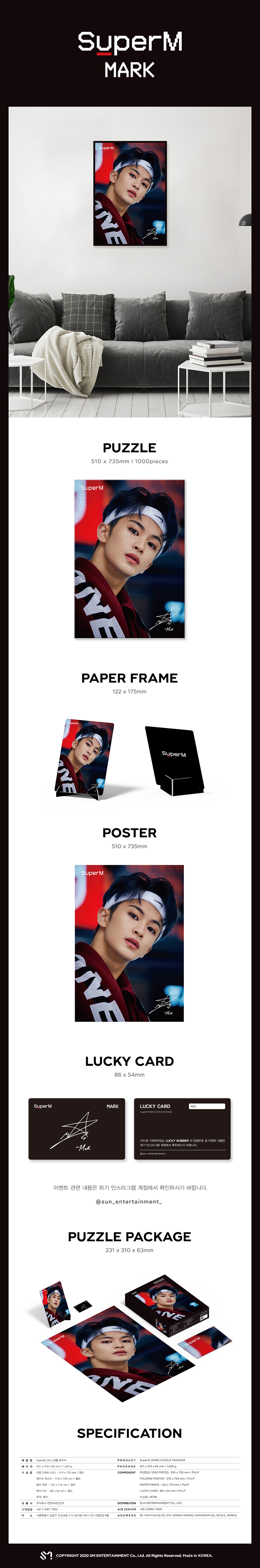 詳細情報運営方針レビューNOTICE* アウトケースは商品保護用制作されスクラッチ及び傷、変色などが包装/配送過程で生じる可能性がございます。これによる交換・返品はできかねます。SuperM puzzle package (MARK ver) [Limited Edition] PART - OUT BOX - PUZZLE (1000piece) - Folded Poster - Paper Frame - Lucky Card INFORMATION 商品情報提供商品名 : SuperM - puzzle package (MARK ver) [Limited Edition]原産地 : Korea製造/輸入 : (주)에스엠엔터테인먼트 (주)썬엔터테인먼트品質保証基準 : 関連法及び消費者紛争の解決規定に従うAS 責任者の連絡先 : Ktown4u, 02-552-0978