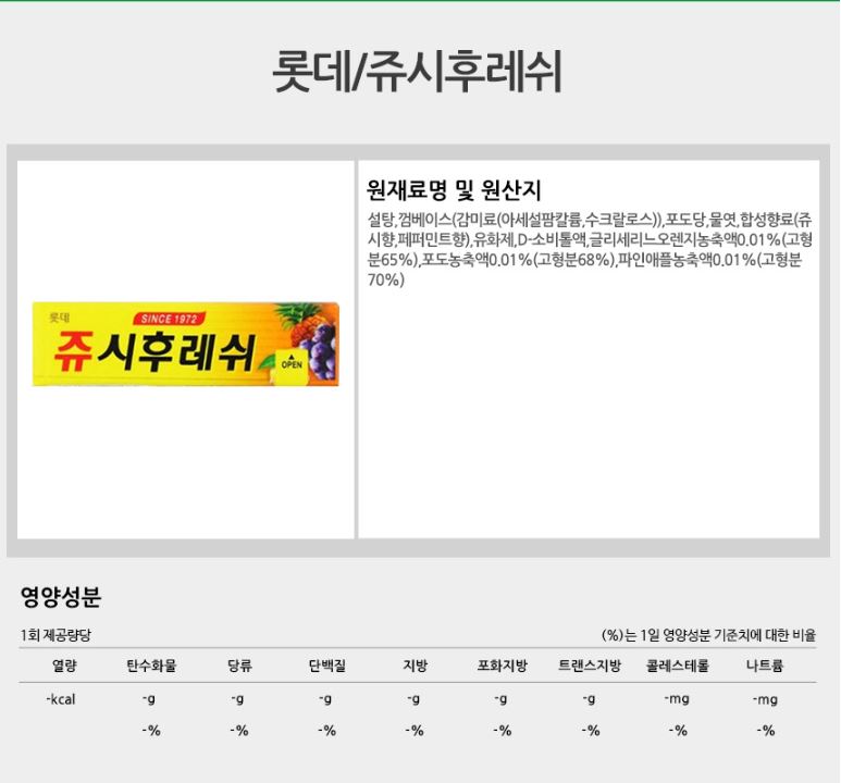 詳細情報運営方針レビューNOTICE* アウトケースは商品保護用制作されスクラッチ及び傷、変色などが包装/配送過程で生じる可能性がございます。これによる交換・返品はできかねます。[LOTTE] ジューシー&フレッシュガム26g*1EA 商品情報提供商品名 : [ロッテ]ジューシー&フレッシュガム26g*1EA原産地 : Korea製造/輸入 : 品質保証基準 : 関連法及び消費者紛争の解決規定に従うAS 責任者の連絡先 : Ktown4u, 02-552-0978