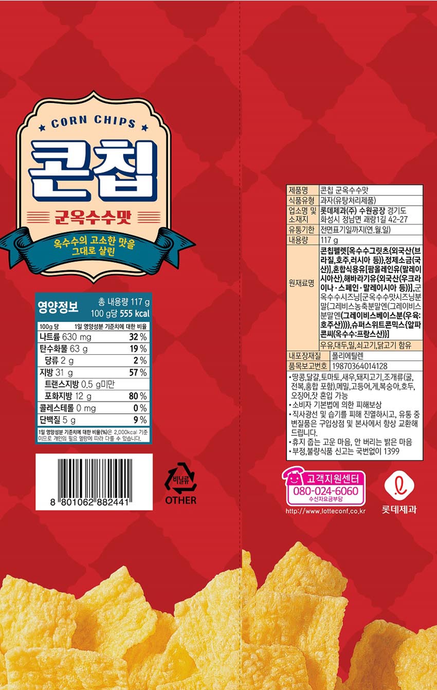詳細情報運営方針レビューNOTICE* アウトケースは商品保護用制作されスクラッチ及び傷、変色などが包装/配送過程で生じる可能性がございます。これによる交換・返品はできかねます。[LOTTE] Corn Chip Gun Corn flavor Big Size*1EA 商品情報提供商品名 : [LOTTE] Corn Chip - Grilled Corn Flavour Big Size*1EA原産地 : Korea製造/輸入 : 品質保証基準 : 関連法及び消費者紛争の解決規定に従うAS 責任者の連絡先 : Ktown4u, 02-552-0978
