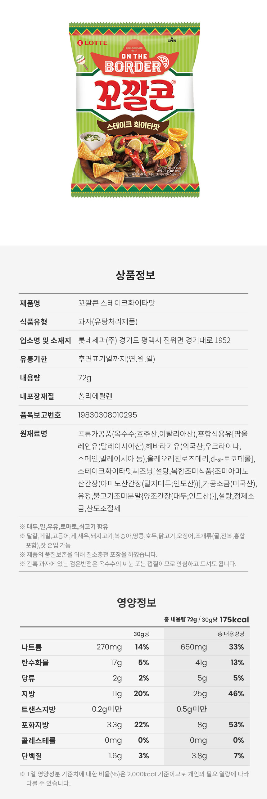 詳細情報運営方針レビューNOTICE* アウトケースは商品保護用制作されスクラッチ及び傷、変色などが包装/配送過程で生じる可能性がございます。これによる交換・返品はできかねます。[LOTTE] Kkokkal corn Steak Fajitas flavor 72g*1EA 商品情報提供商品名 : [LOTTE] Kkokkal corn Steak Fajitas flavor 72g*1EA原産地 : Korea製造/輸入 : 品質保証基準 : 関連法及び消費者紛争の解決規定に従うAS 責任者の連絡先 : Ktown4u, 02-552-0978