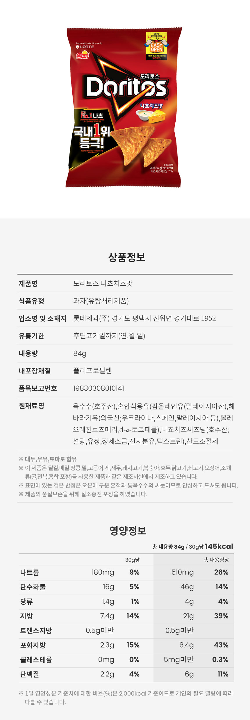 詳細情報運営方針レビューNOTICE* アウトケースは商品保護用制作されスクラッチ及び傷、変色などが包装/配送過程で生じる可能性がございます。これによる交換・返品はできかねます。[LOTTE] ドリトスナチョチーズ 小サイズ 84g*1EA 商品情報提供商品名 : [ロッテ] ドリトスナチョチーズ 小サイズ 84g*1EA原産地 : Korea製造/輸入 : 品質保証基準 : 関連法及び消費者紛争の解決規定に従うAS 責任者の連絡先 : Ktown4u, 02-552-0978
