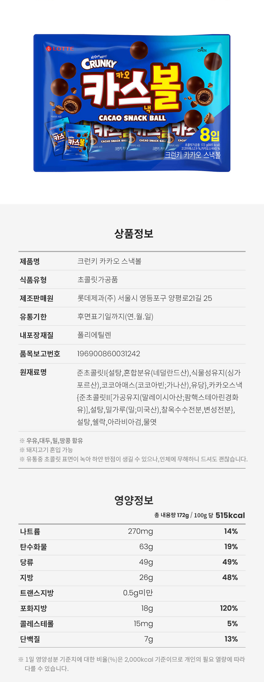 詳細情報運営方針レビューNOTICE* アウトケースは商品保護用制作されスクラッチ及び傷、変色などが包装/配送過程で生じる可能性がございます。これによる交換・返品はできかねます。[ロッテ] クランキーカカオスナックボール172g*1パック(8EA) 商品情報提供商品名 : [ロッテ]クランキーカカオスナックボール172g*1パック(8EA)原産地 : Korea製造/輸入 : 品質保証基準 : 関連法及び消費者紛争の解決規定に従うAS 責任者の連絡先 : Ktown4u, 02-552-0978
