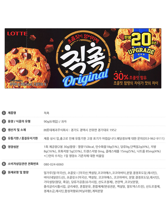 詳細情報運営方針レビューNOTICE* アウトケースは商品保護用制作されスクラッチ及び傷、変色などが包装/配送過程で生じる可能性がございます。これによる交換・返品はできかねます。[LOTTE] チクチョクオリジナル90g*1EA 商品情報提供商品名 : [ロッテ] チクチョクオリジナル90g*1EA原産地 : Korea製造/輸入 : 品質保証基準 : 関連法及び消費者紛争の解決規定に従うAS 責任者の連絡先 : Ktown4u, 02-552-0978