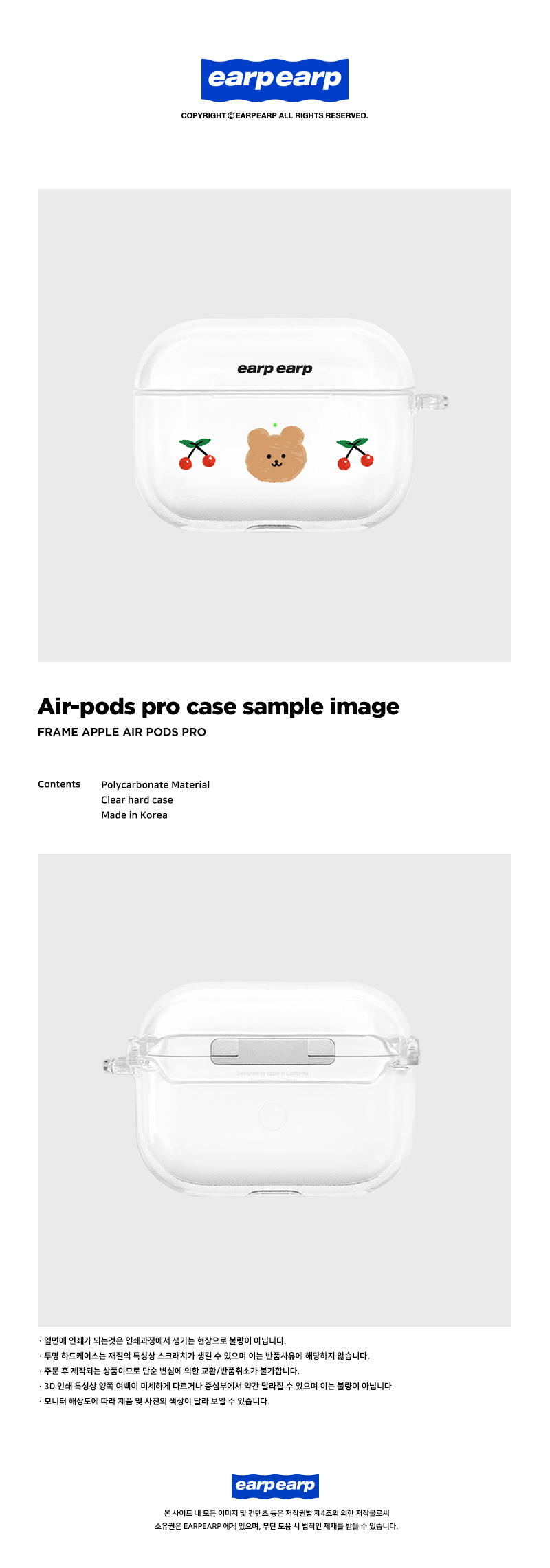 詳細情報運営方針レビューNOTICE* アウトケースは商品保護用制作されスクラッチ及び傷、変色などが包装/配送過程で生じる可能性がございます。これによる交換・返品はできかねます。[earpearp] Cherry covy-clear (air pods pro) 商品情報提供商品名 : [earpearp] Cherry covy-clear (air pods pro)原産地 : Korea製造/輸入 : earp earp earp earp品質保証基準 : 関連法及び消費者紛争の解決規定に従うAS 責任者の連絡先 : Ktown4u, 02-552-0978
