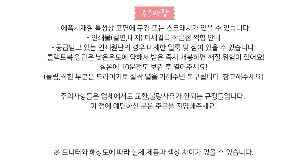 2. 콜렉트북 원단은 낮은 온도에 약해서 받은 즉시 개봉하면 깨질 위험이 있어요!