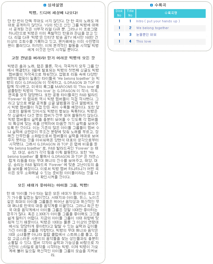 詳細情報運営方針レビューNOTICE* アウトケースは商品保護用制作されスクラッチ及び傷、変色などが包装/配送過程で生じる可能性がございます。これによる交換・返品はできかねます。商品情報提供商品名 : Big Bang - Single Album Vol.1 (CD + DVD)原産地 : Korea製造/輸入 : YG Entertainment 와이지플러스品質保証基準 : 関連法及び消費者紛争の解決規定に従うAS 責任者の連絡先 : Ktown4u, 02-552-0978