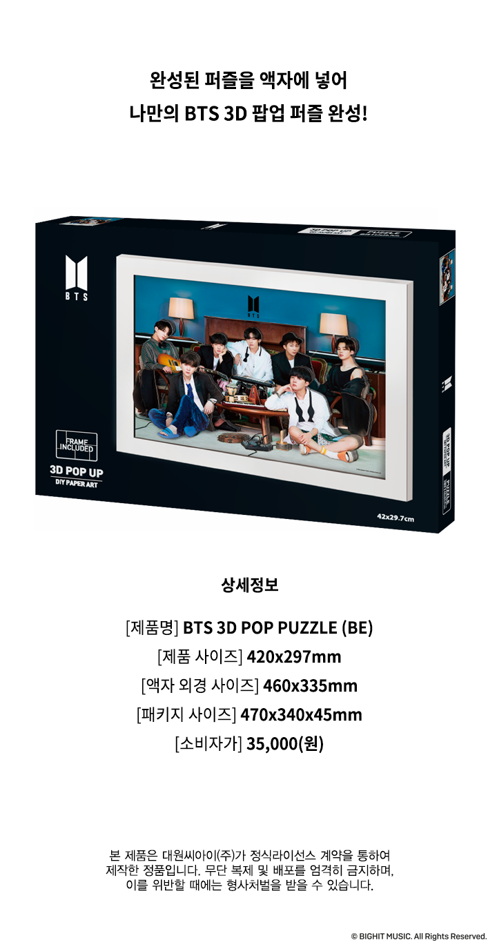 詳細情報運営方針レビューNOTICE* アウトケースは商品保護用制作されスクラッチ及び傷、変色などが包装/配送過程で生じる可能性がございます。これによる交換・返品はできかねます。BTS POP UP PUZZLE : BE PART * 아웃박스는 상품 보호를 위한 충격 방지용으로 제작되어 미세한 스크래치 및 흠집, 변색 등이 포장/배송 과정에서 생겨날 수 있고 이는 교환 사유가 될 수 없습니다. * The outer case is just for protecting goods. (scratches and discoloration on the case can not be the reason for exchanging or returning) TRACK LIST INFORMATION 商品情報提供商品名 : BTS POP UP PUZZLE : BE原産地 : Korea製造/輸入 : 品質保証基準 : 関連法及び消費者紛争の解決規定に従うAS 責任者の連絡先 : Ktown4u, 02-552-0978