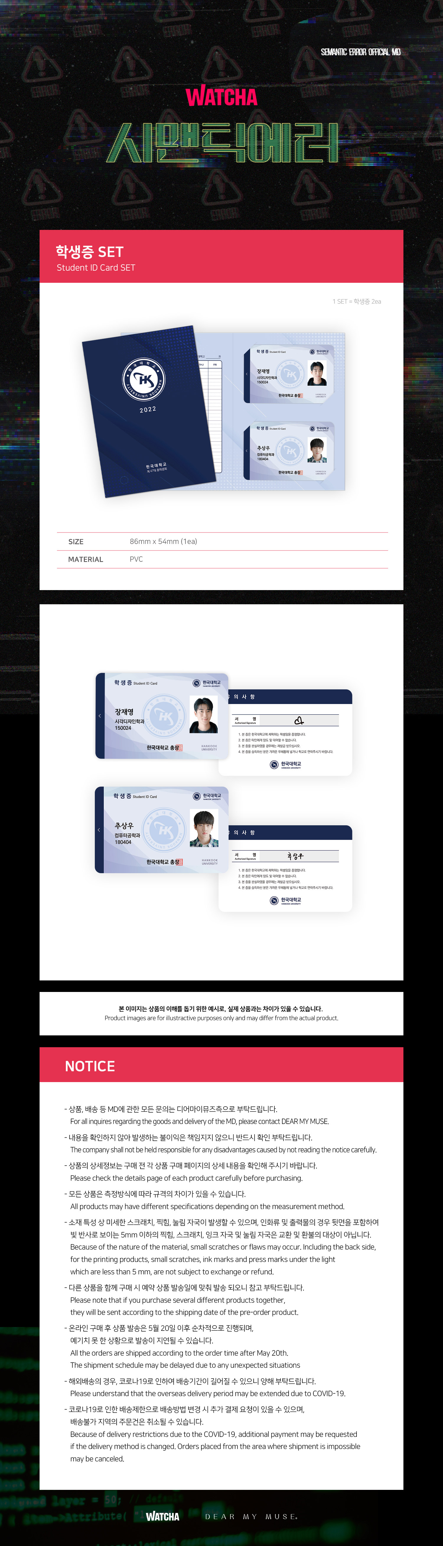 詳細情報運営方針レビューNOTICE* アウトケースは商品保護用制作されスクラッチ及び傷、変色などが包装/配送過程で生じる可能性がございます。これによる交換・返品はできかねます。[SEMANTIC ERROR Official MD] PART * 아웃박스는 상품 보호를 위한 충격 방지용으로 제작되어 미세한 스크래치 및 흠집, 변색 등이 포장/배송 과정에서 생겨날 수 있고 이는 교환 사유가 될 수 없습니다. * The outer case is just for protecting goods. (scratches and discoloration on the case can not be the reason for exchanging or returning) INFORMATION 商品情報提供商品名 : [SEMANTIC ERROR Official MD] Student ID SET原産地 : Korea製造/輸入 : 品質保証基準 : 関連法及び消費者紛争の解決規定に従うAS 責任者の連絡先 : Ktown4u, 02-552-0978