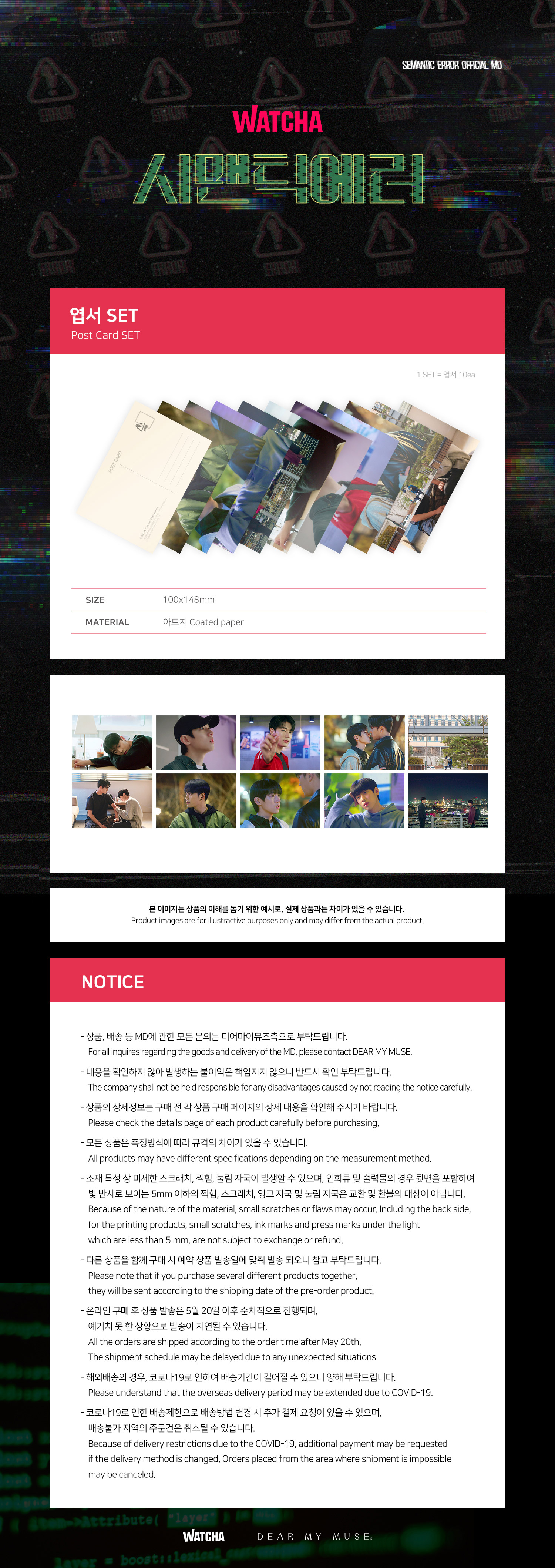 詳細情報運営方針レビューNOTICE* アウトケースは商品保護用制作されスクラッチ及び傷、変色などが包装/配送過程で生じる可能性がございます。これによる交換・返品はできかねます。[SEMANTIC ERROR Official MD] PART * 아웃박스는 상품 보호를 위한 충격 방지용으로 제작되어 미세한 스크래치 및 흠집, 변색 등이 포장/배송 과정에서 생겨날 수 있고 이는 교환 사유가 될 수 없습니다. * The outer case is just for protecting goods. (scratches and discoloration on the case can not be the reason for exchanging or returning) INFORMATION 商品情報提供商品名 : [SEMANTIC ERROR Official MD] Post Card SET原産地 : Korea製造/輸入 : 品質保証基準 : 関連法及び消費者紛争の解決規定に従うAS 責任者の連絡先 : Ktown4u, 02-552-0978