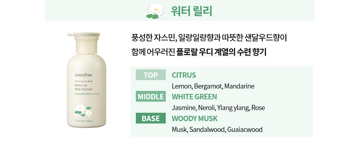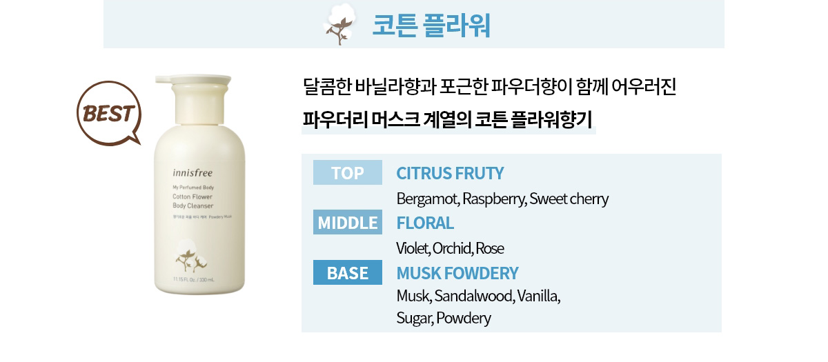 詳細情報運営方針レビューNOTICE* アウトケースは商品保護用制作されスクラッチ及び傷、変色などが包装/配送過程で生じる可能性がございます。これによる交換・返品はできかねます。 [INNISFREE] My Perfumed Body Cotton Flower Body Cleanser PART * The outer case is just for protecting goods. (scratches and discoloration on the case can not be the reason for exchanging or returning) INFORMATION 商品情報提供商品名 : innisfree My Perfumed Body Cotton Flower Body Cleanser原産地 : Korea製造/輸入 : 아네시(Annecy) 아네시(Annecy)品質保証基準 : 関連法及び消費者紛争の解決規定に従うAS 責任者の連絡先 : Ktown4u, 02-552-0978