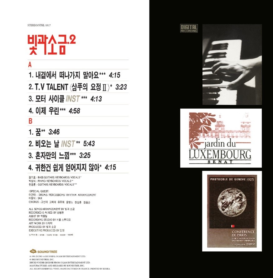 데뷔작처럼 대 히트곡의 인기에 힘입어 폭발적 사랑을 받은 건 아니지만 빛과 소금의 두 번째 앨범에는 이후 꾸준히 애청되고 불려 온 발라드 「내 곁에서 떠나가지 말아요」를 비롯하여 세 멤버가 자신들의 우월한 역량을 한껏 표출한 뛰어난 곡들이 수록되어 있다. 프로그래밍을 통한 드럼 사운드를 담았던 데뷔작과 달리 이 앨범에서는 검은 나비와 송골매를 거친 드러머 이건태 가 리듬 편곡과 더불어 드럼과 타악기 연주를 들려주었으며, 장필순 과 그룹 마로니에의 유주희 등이 코러스에 참여했다. 재즈 퓨전은 물론 팝 발라드와 소프트 록, AOR의 향취가 넘실대는 다채로운 색을 지닌 곡들은 어느 한 곡 할 것 없이 듣는 이를 매료할 정도로 탁월하다. 이 앨범이 데뷔작에 뒤지지 않는 나무랄 데 없는 수작(秀作)임을 말해 준다. 앨범 커버에 등장하는 몇몇 이미지는 꽤나 이채롭다. 앞면의 프랑스 국방부 산하 군 정보· 홍보국 로고, 뒷면의 “뤽상부르” 공원과 1989년 화학 무기 금지를 위한 파리 국제 회의 포스터 같은, 음악과 무관한 이 이미지들에서 당시 해외 여행 자유화 속에서 일었던 배낭여행 붐과 열망, 다녀온 이들의 과시 등 그때의 공기가 새삼 느껴진다.