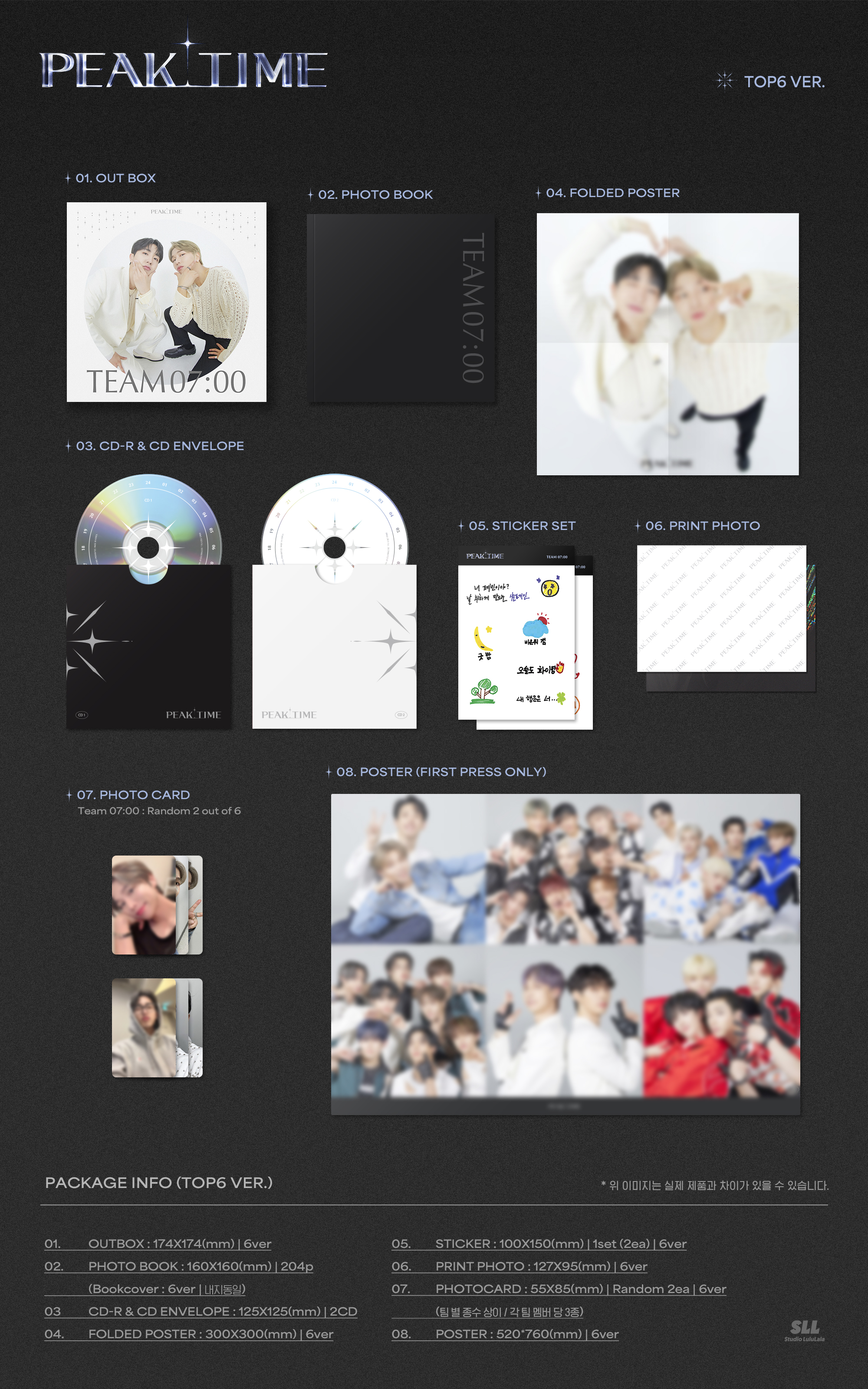 * 구성(1종 당): 자켓커버 1종 + 포토북 1종 + CDR2 + 스티커 1세트(2종) + 접지 포스터 1종 + TOP6 포스터 1종 + 포토카드 (6종 중 2종 랜덤) + 인화사진 1종
