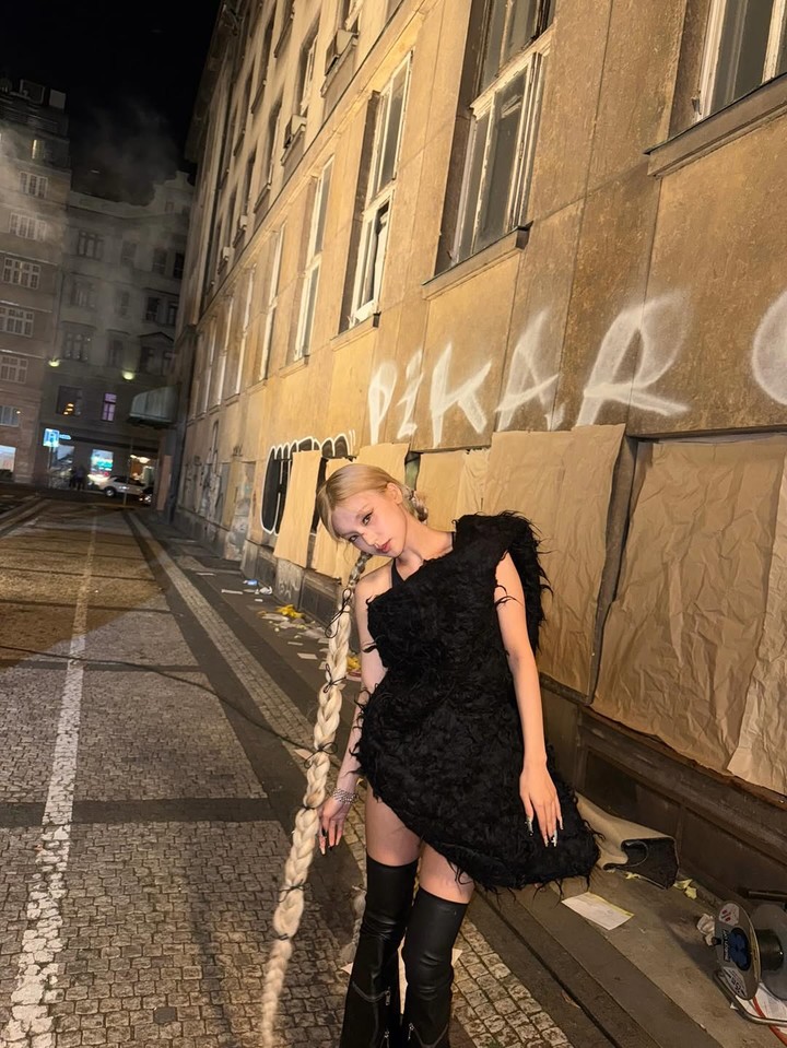 On the 18th, Yeji shared multiple behind-the-scenes photos from a shoot on her social media, captioned "Work work work." In these images, Yeji stuns in a black one-shoulder mini dress paired with thigh-high boots, creating a bold and powerful silhouette. Her dramatically long hair, styled to nearly sweep the floor, instantly caught the eyes of fans and netizens alike.