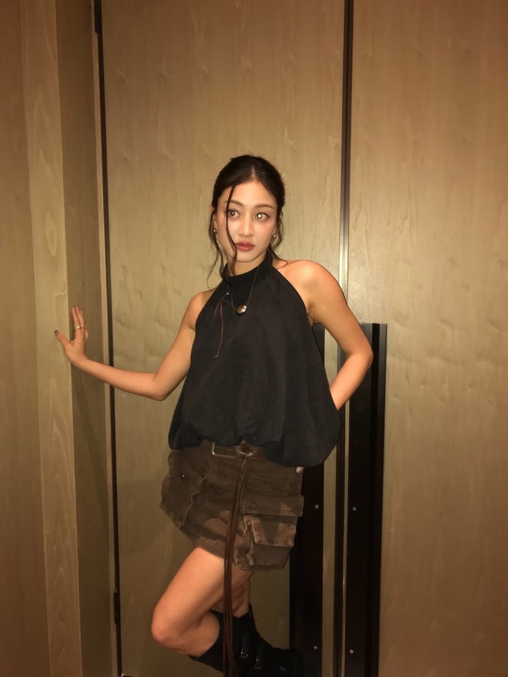 ホルターネックブラウスとミニカーゴスカートのルックでは、ボリュームのあるバルーンデザインのトップスで逆三角のシルエットを作り出し、パーティーにもぴったりのグラマラスなY2K感性を演出した。