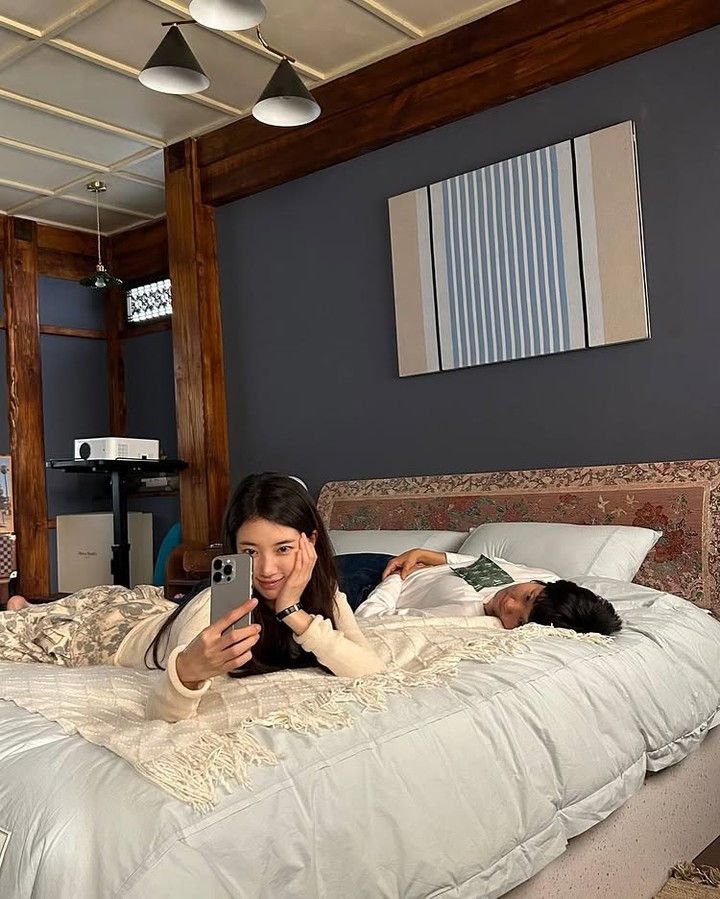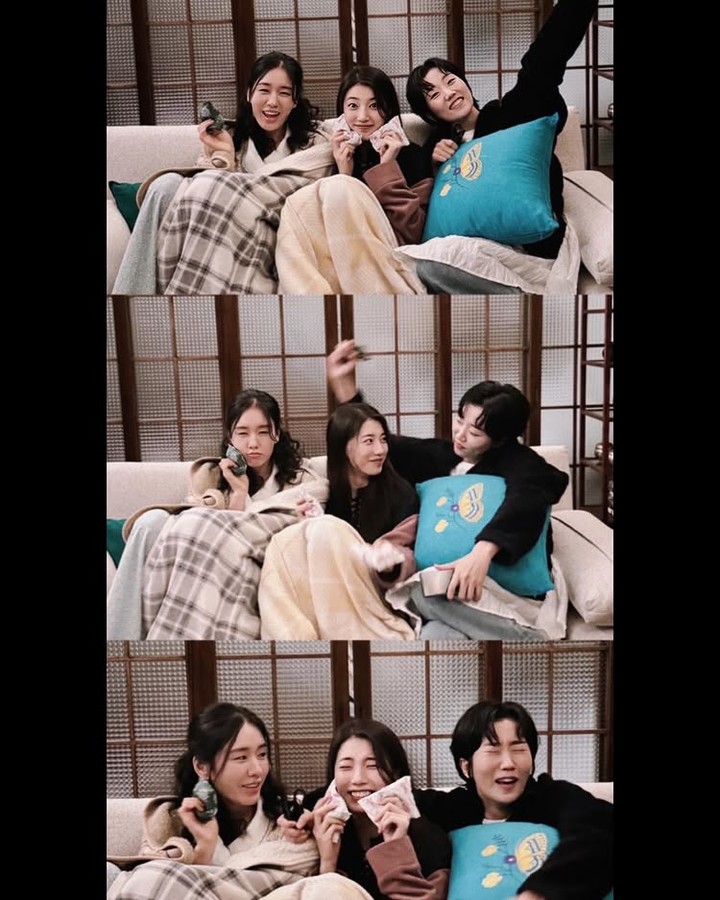 사진에는 수지가 극 중 함께 출연 중인 배우 안은진, 이주영과 나란히 소파에 앉아 핫팩을 얼굴에 댄 채 편안한 자세를 취한 모습이 담겼다. 쿠션 사이에 기대어 앉은 모습은 여유로운 분위기를 전했고, 또 다른 사진에서는 배우 이주영 옆에서 침대에 엎드려 셀카를 촬영하며 친근을 자아냈다.