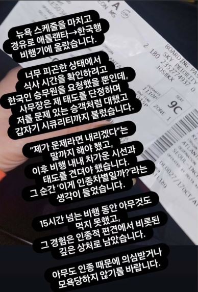 이어 "수면 시간이나 컨디션 조절 등을 위해 매번 비행기 탑승 후 식사 스케줄을 확인하고 있다. 이번에도 어김없이 탑승 후 짐 정리를 마치고 식사 시간을 확인하기 위해 승무원에게 문의했으나 제가 영어로 완벽하게 소통할 정도의 실력은 아니기에 대화를 진행하기 어려웠다"고 당시 상황을 설명했다.