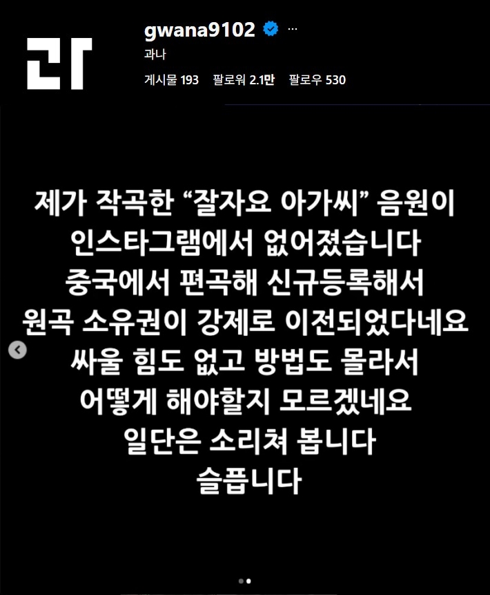 (MHN 홍동희 선임기자) 프로젝트 그룹 ASMRZ(닛몰캐시, 김경욱)의 메가 히트곡 '잘자요 아가씨(prod. Gwana)'가 중국 음원 업체에 의해 무단 편곡·재등록되어 메타 플랫폼에서 원곡이 삭제되는 초유의 저작권 도용 사건이 발생했다. 원작자인 이재광('과나') 씨가 "싸울 힘도 없고 방법도 모르겠다"며 피해를 호소한 가운데, 이 문제를 해결하고 원곡의 권리를 되찾는 과정에 더크로스 멤버이자 한국음악저작권협회(KOMCA) 이사인 이시하의 숨은 노력이 있었던 것으로 단독 확인됐다.